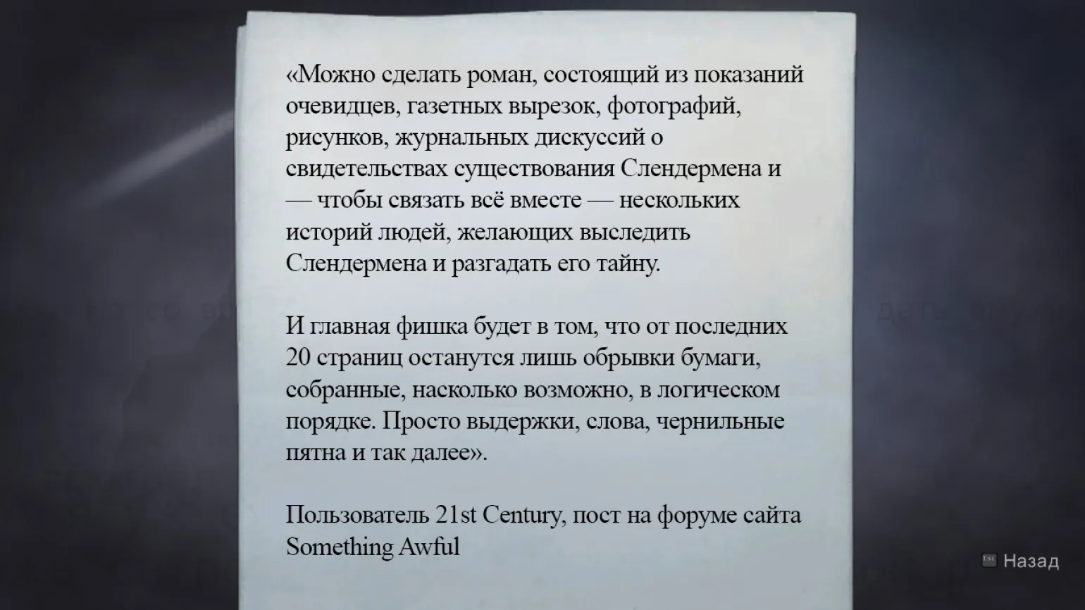 Всё это добавляет повествованию налёт псевдодокументальности, к которому так часто стремятся крипипасты и вдохновлённые ими игры. Например.