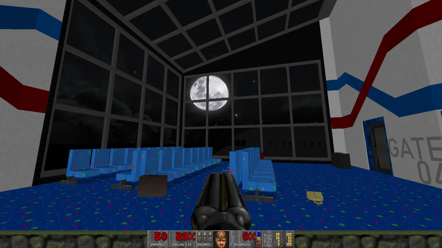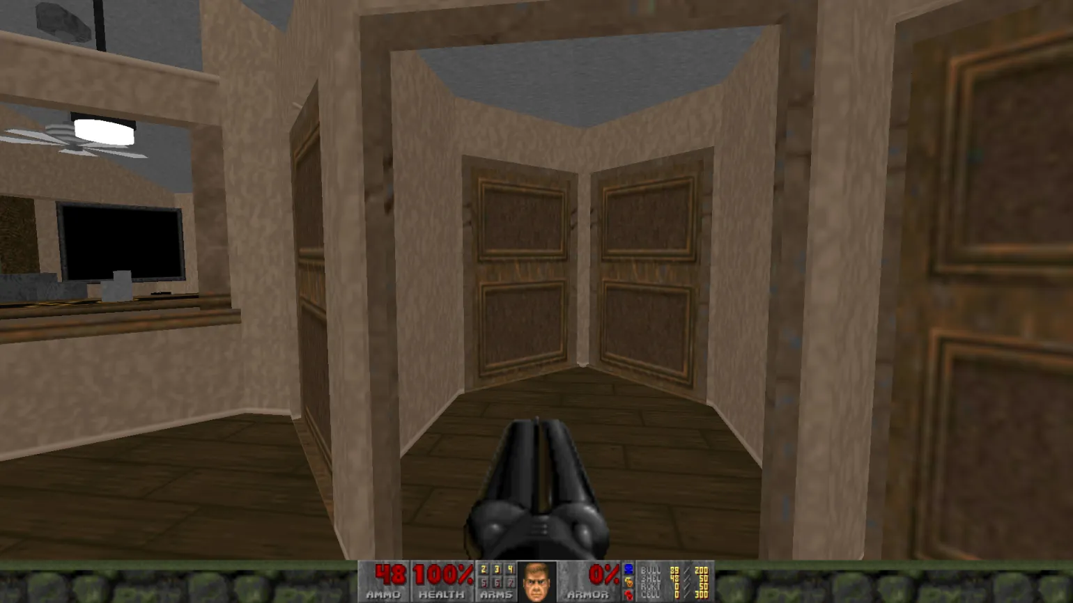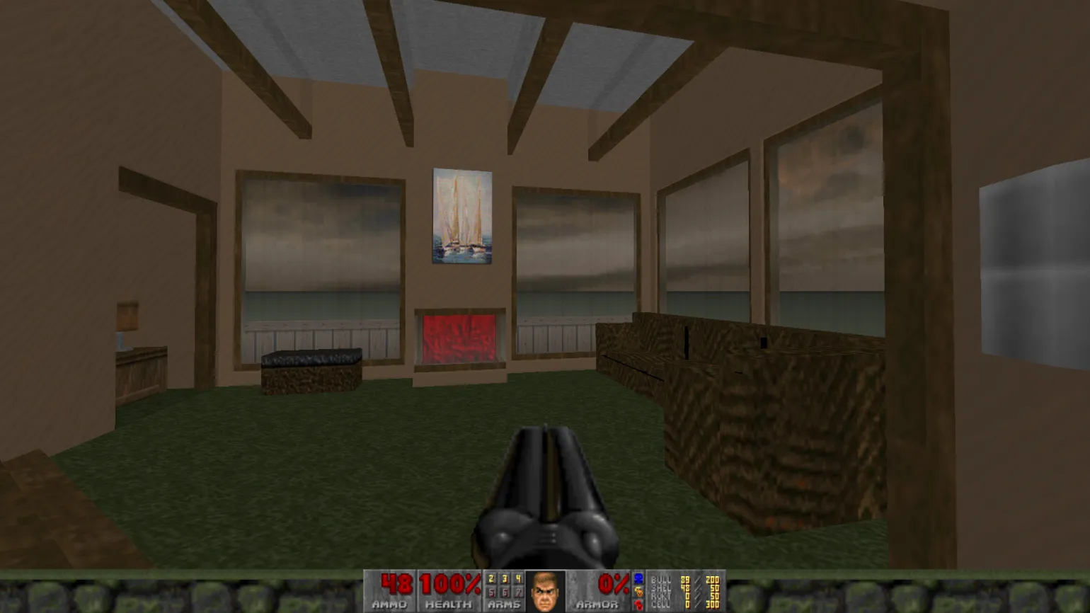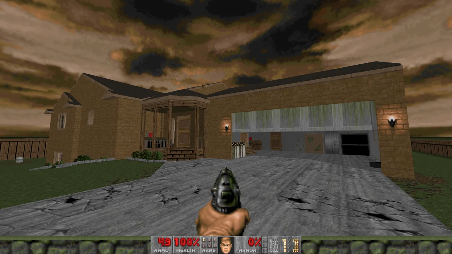 Запустив уровень, мы видим стандартный загородный коттедж с пристройкой в виде гаража и жилым цоколем. В своё время такие карты на основе уже существующих зданий и интерьеров, реальных либо выдуманных, в изобилии встречались на форумах по Doom. Вот, например, карта Seinfeld.wad, воссоздающая квартиру Джерри Сайнфелда из сериала «Сайнфелд»: