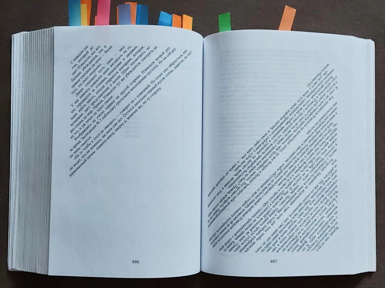 Первый из них это, пожалуй, самая известная фишка книги — её нестандартная вёрстка. Текст романа трансформируется в соответствии с происходящими в книге событиями: он прерывается сигналом SOS, когда герои зовут на помощь, сжимается до узких колонок, чтобы отразить тесноту лабиринта, переворачивается вниз головой, когда в доме меняется гравитация.