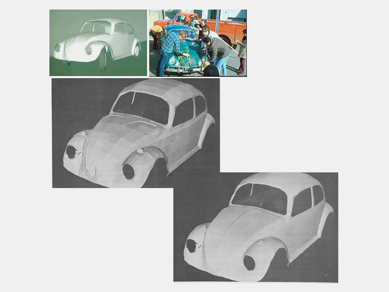 Подход с привлечением профессионалов, заинтересованных новым направлением, обеспечил массу важных открытий в области 3D-графики в следующем десятилетии. В 1972 году группа студентов под руководством Айвена Сазерленда подготовила реалистичную визуализацию автомобиля Volkswagen Beetle. Молодые люди чертили точки и линии прямо на корпусе авто, а затем накидывали поверх них волейбольную сетку, формируя таким образом систему координат.