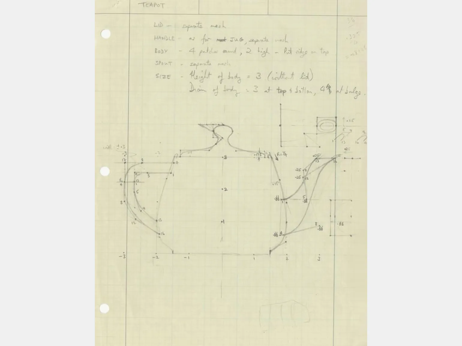 Пожалуй, одним из самых ярких событий того десятилетия стала знаменитая модель «Чайник из Юты», созданная Мартином Ньюэллом в 1975 году. Вдохновившись классическим дизайном керамического заварочного чайника Melitta, Ньюэлл не стал разрисовывать его маркером, чтобы получить точные координаты каждой грани, а просто сделал набросок сосуда карандашом на листе бумаги.