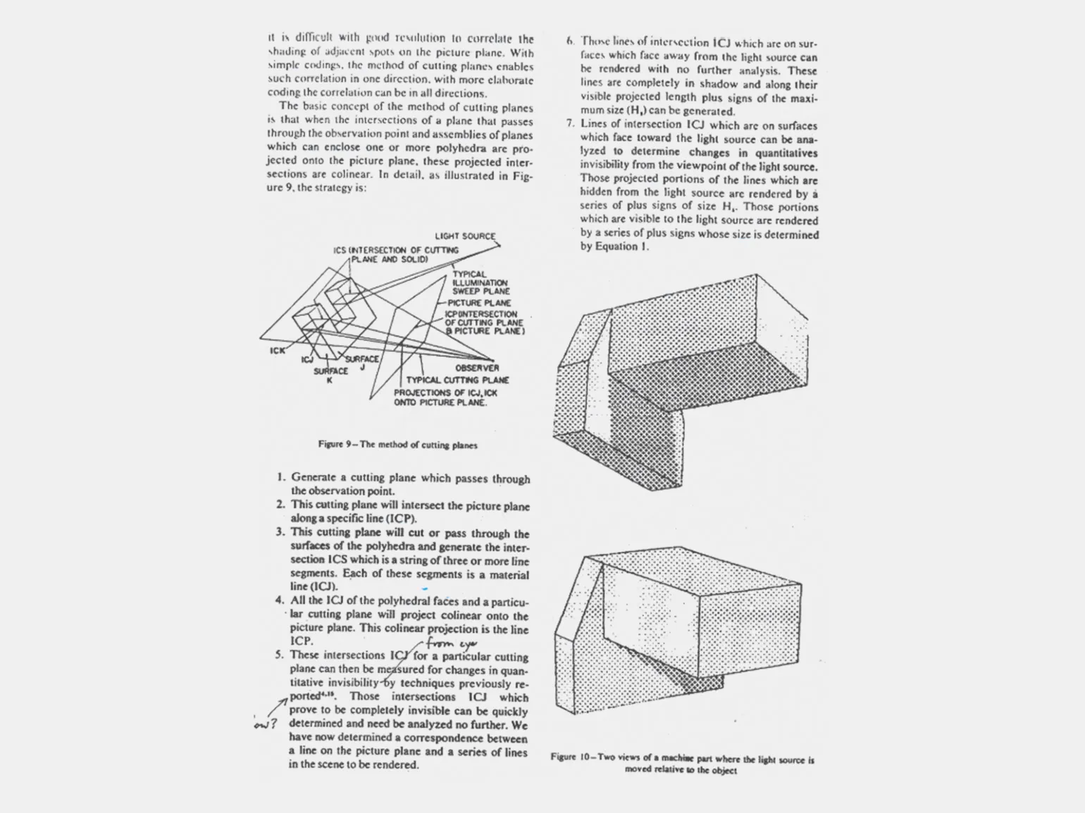 - Алгоритм скрытых поверхностей (Айвен Сазерленд, Роберт Спраул, Роберт Шумейкер). Вычисление неотображаемых участков модели в зависимости от перспективы.