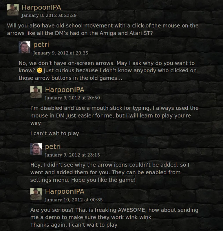 Хорошо, если есть возможность поиграть, но иногда нет и её. Так, к разработчикам Legend of Grimrock обратился парализованный человек, который может управлять только губным манипулятором (mouth stick). Он попросил добавить в игру экранные кнопки.
