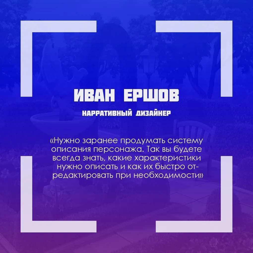 «Обжить» героев — пожалуй, самое сложное и самое важное, что вы можете сделать для истории. Просыпаться с мыслями о них, размышлять о том, как им живётся, разговаривать с ними в своей голове. Для коллег, только начинающих заниматься драматургией, это может звучать как лёгкое помешательство, но именно так вы сможете создать по-настоящему глубоких и многогранных персонажей — проживая жизнь вместе с ними, пусть и внутри вашей головы. Тогда и ваша аудитория сможет прожить с этими героями такую же увлекательную жизнь — только уже в игре.