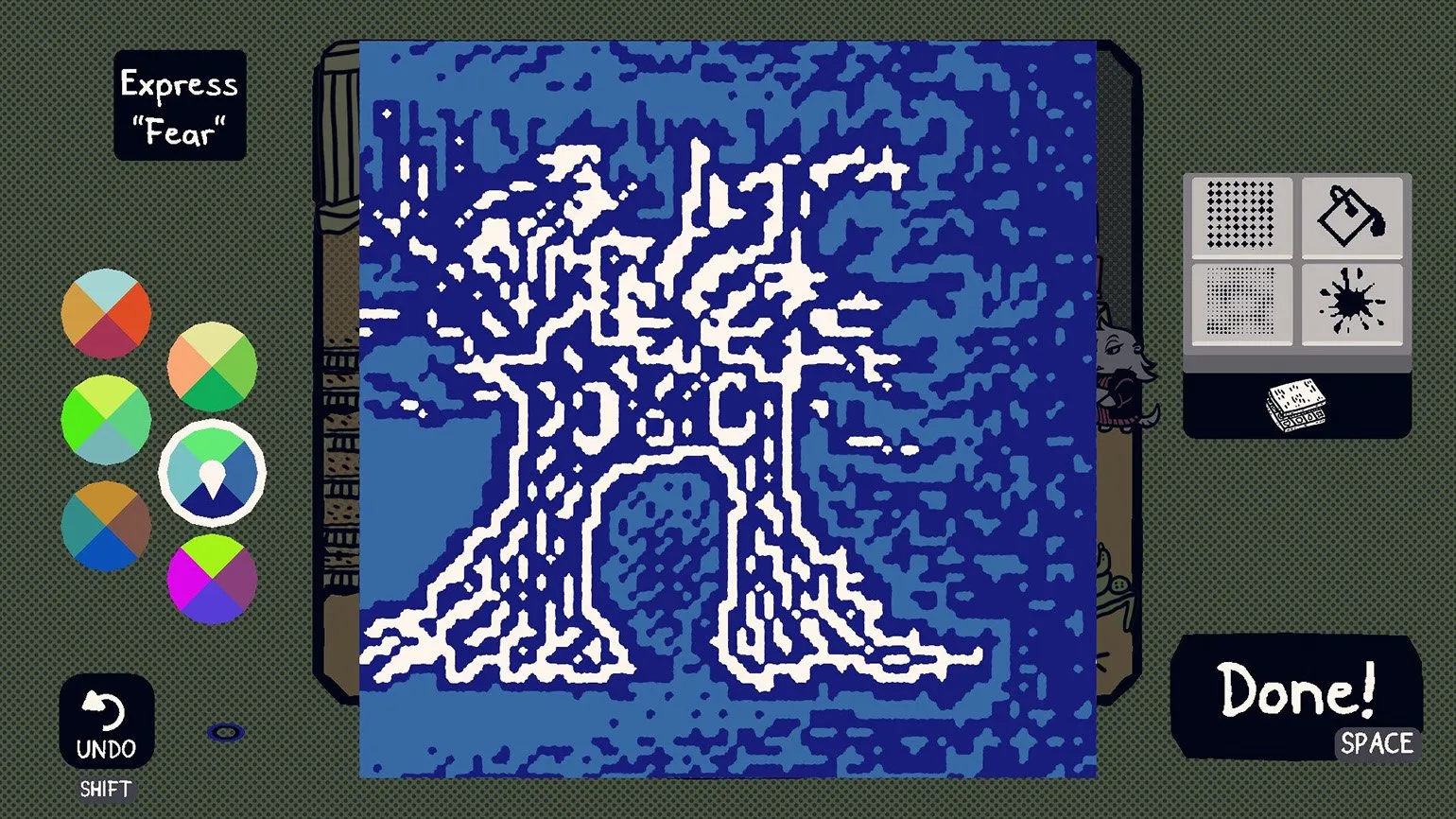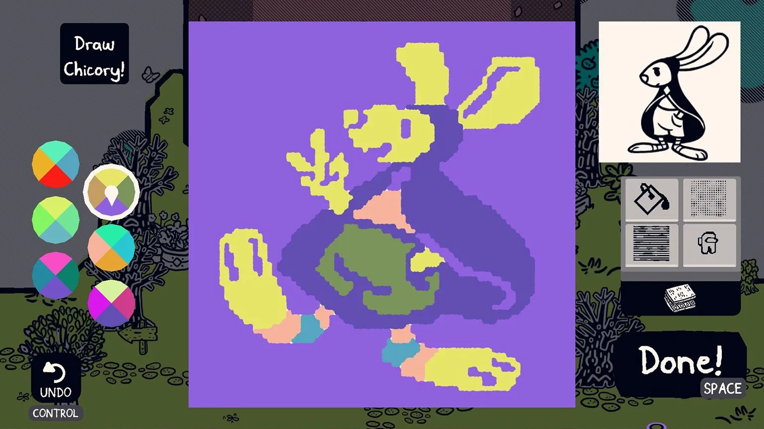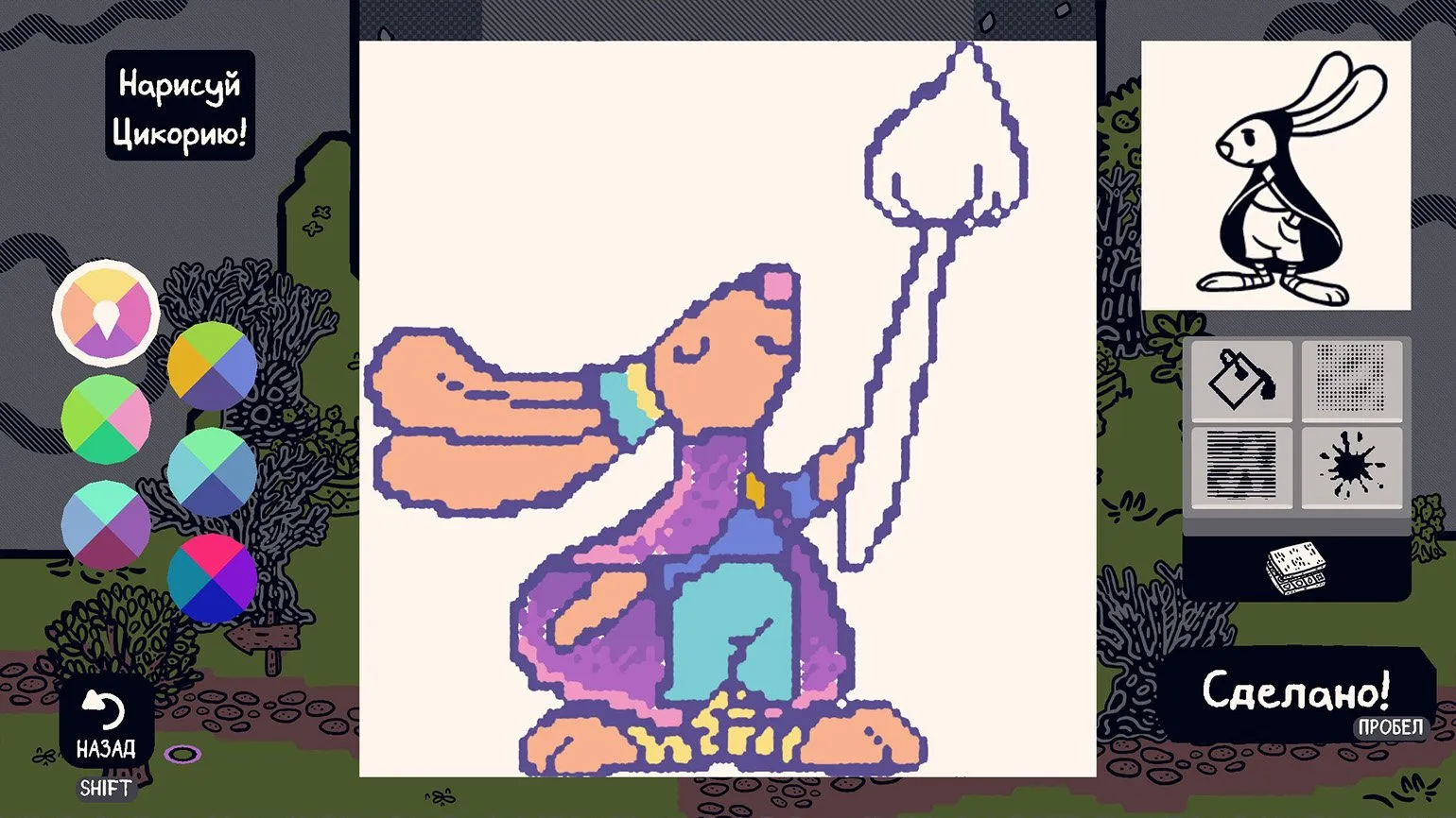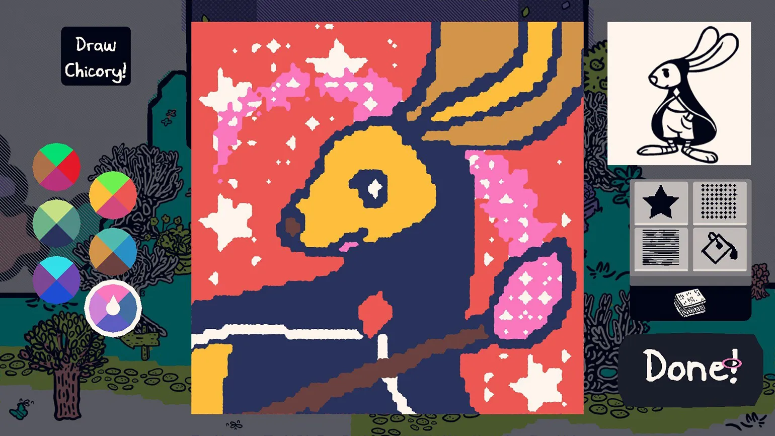 Но если в этих и других проектах рисование в основном представлено как побочное занятие, в которое разработчики даже не всегда закладывают идею самовыражения, то в Chicory свободное творчество лежит в самой основе. Во время работы над игрой Грег вывел несколько правил, которые позволили ему органично встроить рисование в игровую структуру и мотивировать игрока.