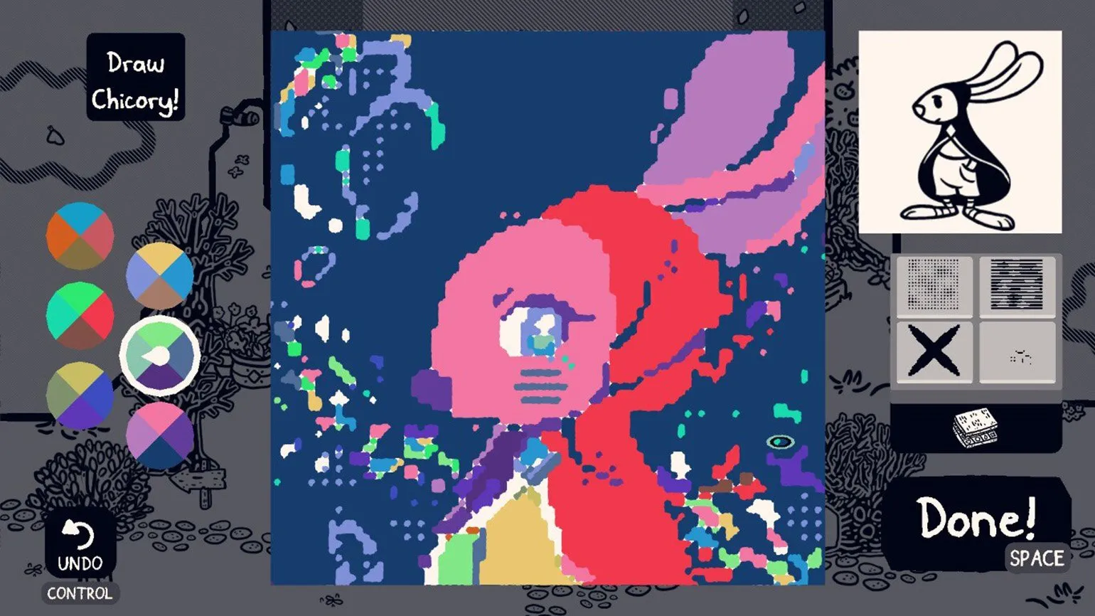 Идея Chicory: A Colorful Tale поставила перед Грегом Лобановым серьёзную задачу: как сделать творчество совершенно необязательным и одновременно подтолкнуть игрока им заниматься? Как совместить второстепенное занятие без всяких целей и наград с прогрессией (сильным внешним мотиватором) так, чтобы оно не только не потерялось на фоне основных событий в игре, но и всегда оставалось в центре? Ведь вся суть Chicory — в рисовании.