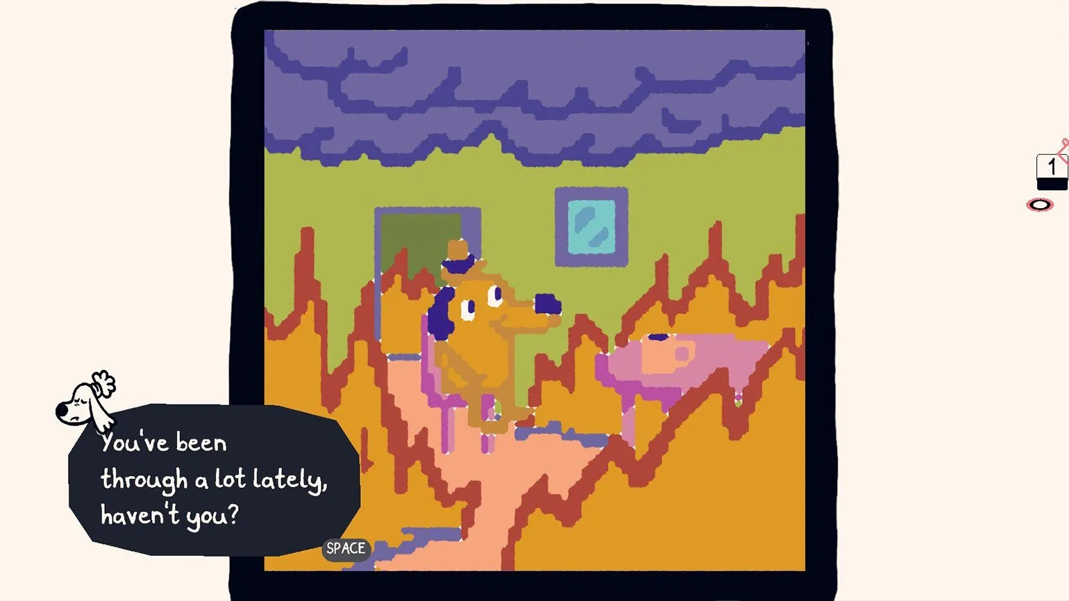 Этот момент сближает двух персонажей, и у игрока есть возможность стать его частью — не просто наблюдать за сценой, но самому поучаствовать в моменте, заняться творчеством вместе с наставницей и выразить через краски свои ощущения. В то же время вам всё ещё предоставляется достаточно свободы: к рисунку нет никаких требований, можно даже отдать пустой холст. Это, конечно, немного поломает нарратив, но до пустых холстов, как правило, дело, не доходит.