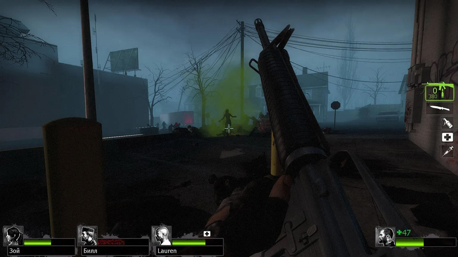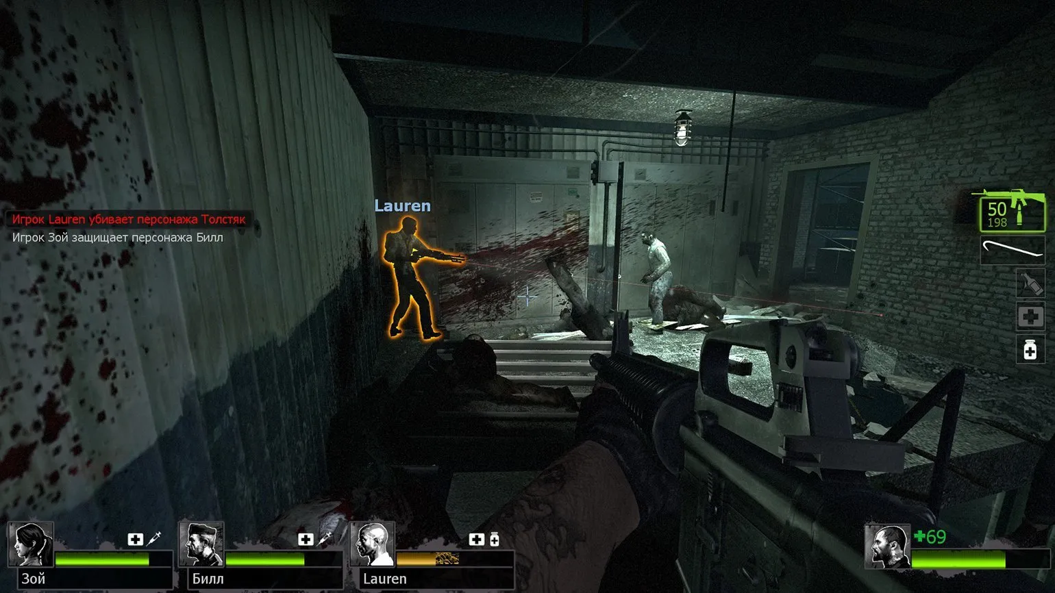 Игра также заботится о том, чтобы вы могли в любой момент узнать о местонахождении и состоянии ваших товарищей: для этого в ней есть силуэты выживших. Обводки видны сквозь стены, а их цвет меняется с синего на оранжевый, когда персонажи падают на землю или попадают под атаку особого заражённого.