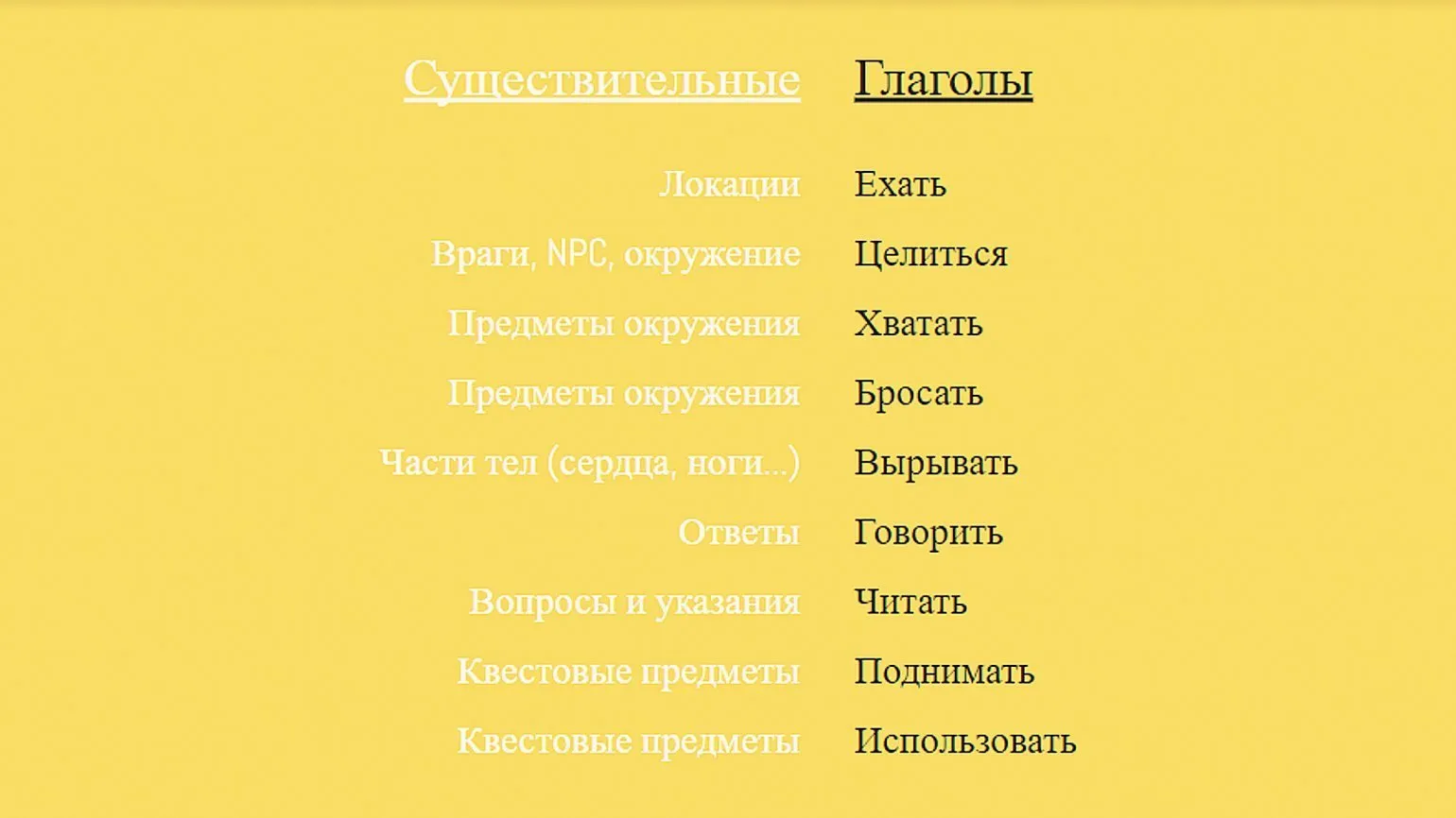 Более нейтральные глаголы вроде «говорить» и «читать» не составляют важную часть геймплея — они связаны только с пассивным восприятием информации о сюжете игры и ключевых механиках.