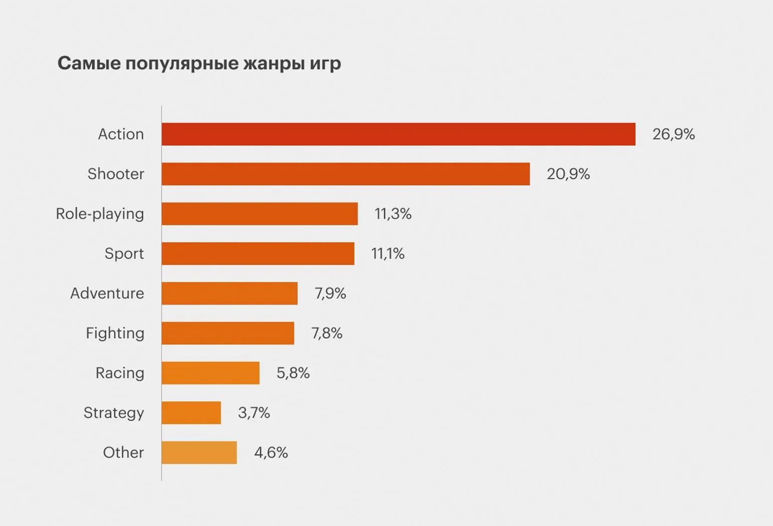 Ту же проблему геймдизайнер увидел и во всей игровой индустрии: так, по данным портала Statista, в 2020 году первые два места в топе американского рынка заняли экшены и шутеры. Жанры, которые следовали за ними, тоже не отличаются миролюбием: это RPG, файтинги, гонки, стратегии — и лишь в конце плелись представители категории, туманно охарактеризованной как «другое».