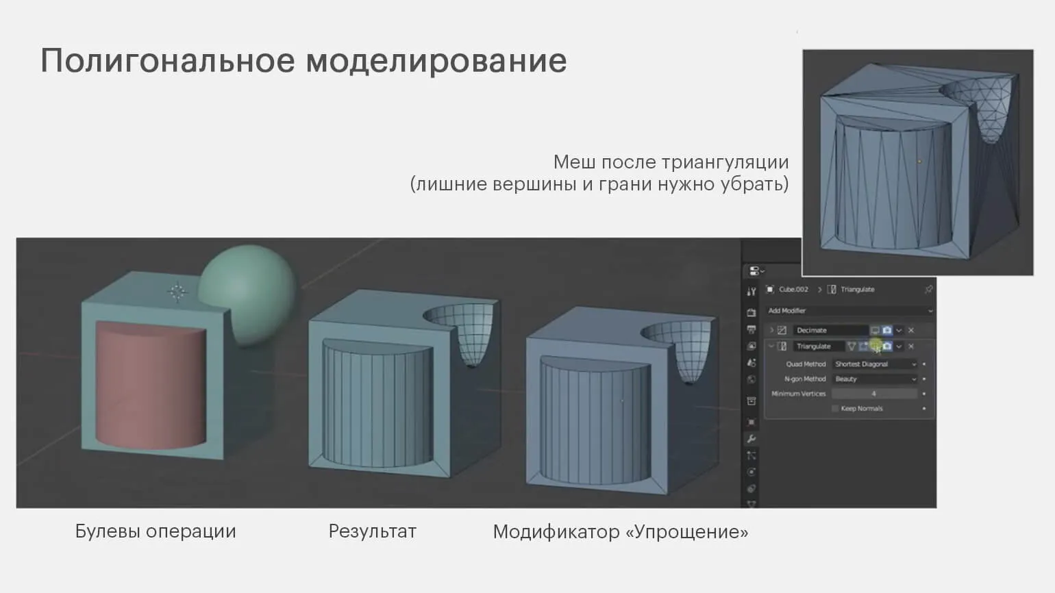Если же говорить о булевых операциях в контексте полигонального моделирования, то процесс выглядит следующим образом. Построив основную форму, Педро производит необходимые отсечения модификатором Логический (Boolean), добавляет модификатор Триангуляция (Triangulate), а затем делает ремеш модификатором Упрощение (Decimate). Последний хорошо справляется с задачей, если у модели изначально настроены группы сглаживания, которые можно откорректировать модификатором Сглаживание (Smooth).