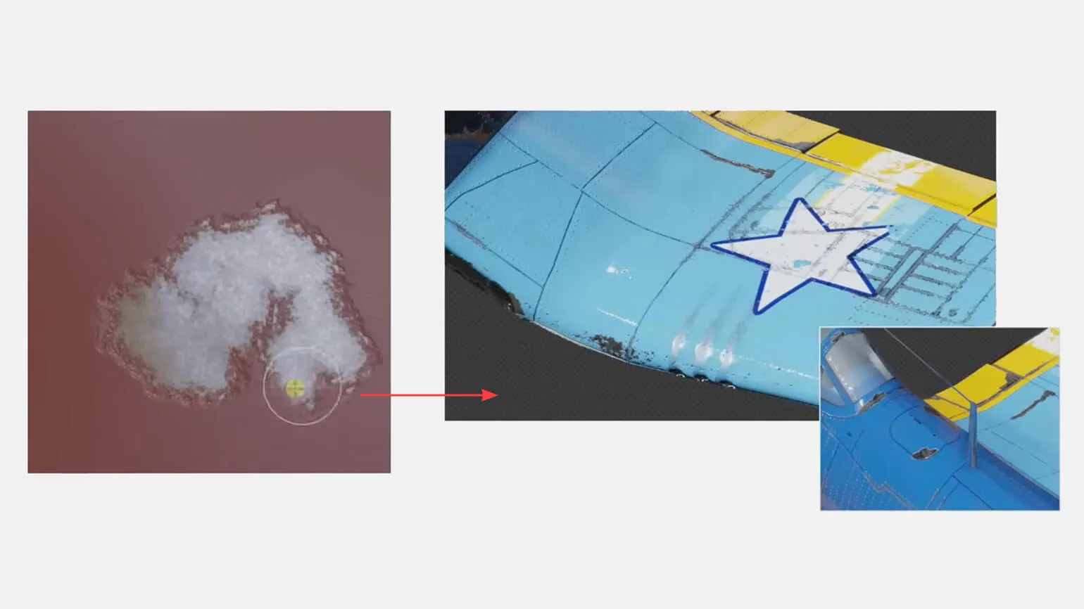 Процесс во многом схож с тем, что предлагает Substance Painter, но в Blender он реализован немного иначе. Во время прорисовки Педро столкнулся с тем, что чёрно-белая карта высот должна быть 32-битной, иначе она не будет работать. На отрисовку всей поверхности самолёта у художника ушло примерно полдня. Референсы направления линий он частично брал из ранее подобранных чертежей. В итоге у него получилась карта высот, полностью отрисованная в Blender.