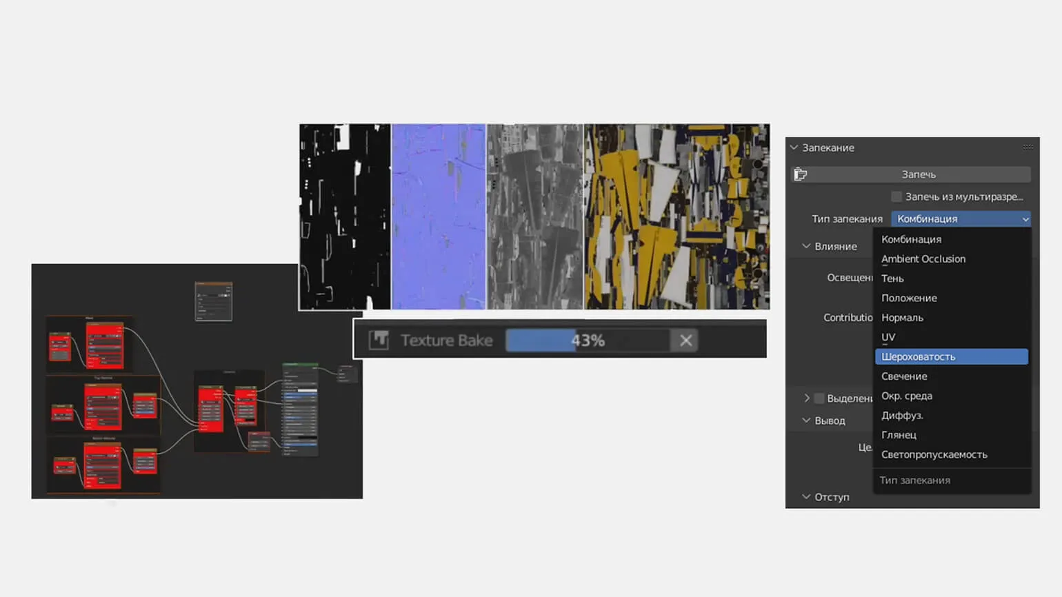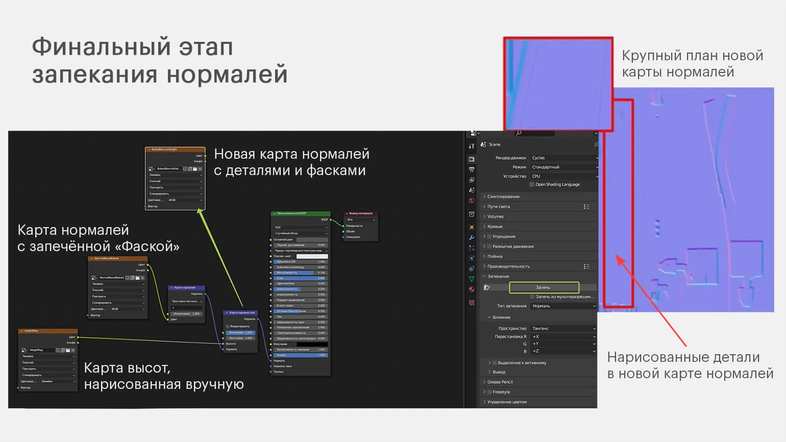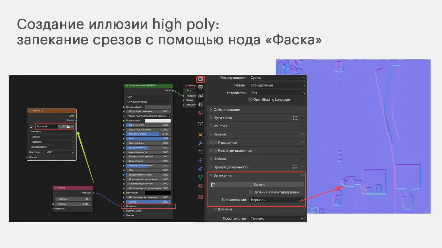 После того как проект одобрен, Педро приступает к этапу запекания нормалей. Так как модель низкополигональная, у неё не будет плавных фасок по краям. Но можно прибегнуть к хитрости и создать имитацию среза в режиме шейдеров, а затем запечь полученный результат. Для этого необходимо соединить нод Фаска (Bevel) с параметром Нормаль (Normal) в шейдере Принципиальный BSDF (Principled BSDF), после чего запечь карту нормалей — с этим поможет вкладка Запекание (Bake) в настройках рендера Cycles.