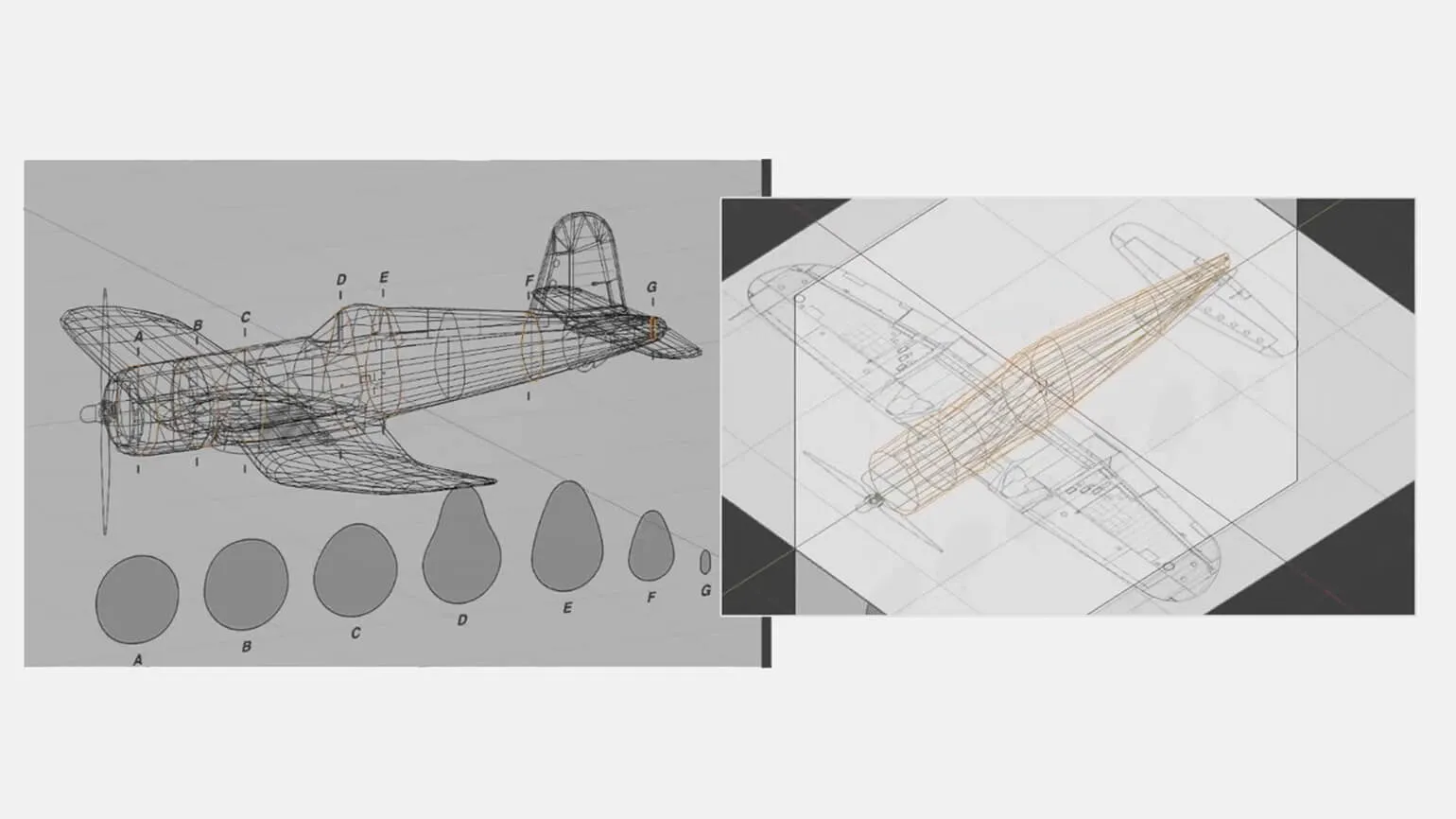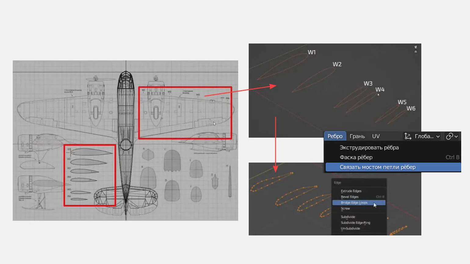 На следующем этапе Педро начинает выравнивать оси по чертежу, взяв за основу плоскость. В Режиме редактирования (Edit mode) он отмечает вершины форм, представленные в легенде, и объединяет их функцией «Связать мостом петли рёбер» (Bridge Edge Loops). Этим способом можно быстро сформировать полигональную сетку крыла.