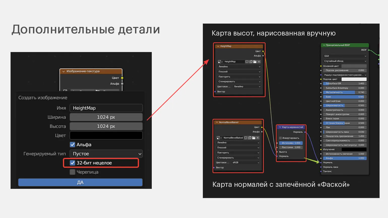 Эту карту высот, а также ранее запечённую карту нормалей (с фаской) Педро присоединил к ноду Карты неровностей (Bump). А затем запёк их вместе в одну карту нормалей.