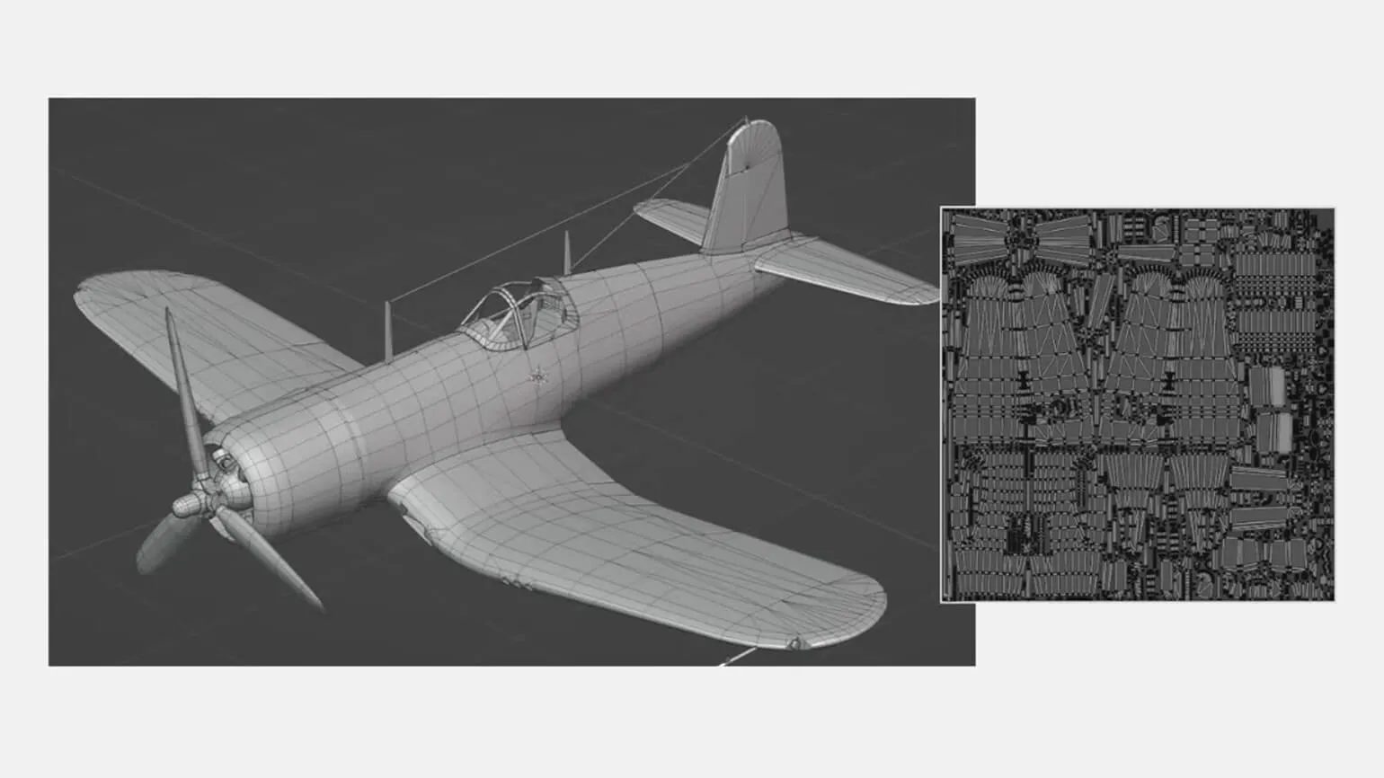 Площадь тех или иных UV-островов зависит от перспективы игрока. Например, большую часть игрового времени в Wings of Heroes игрок наблюдает только заднюю часть самолёта. Именно поэтому UV-острова для хвоста и задней части крыльев (отмечены оранжевым и красным на изображении ниже) занимают больше всего места в UV-пространстве. Соответственно, текстуры на них будут более высокого разрешения.