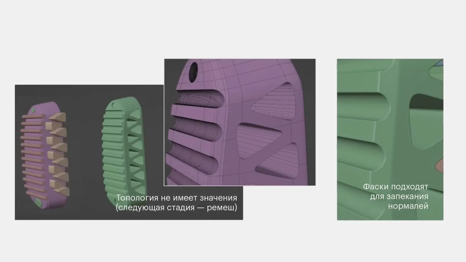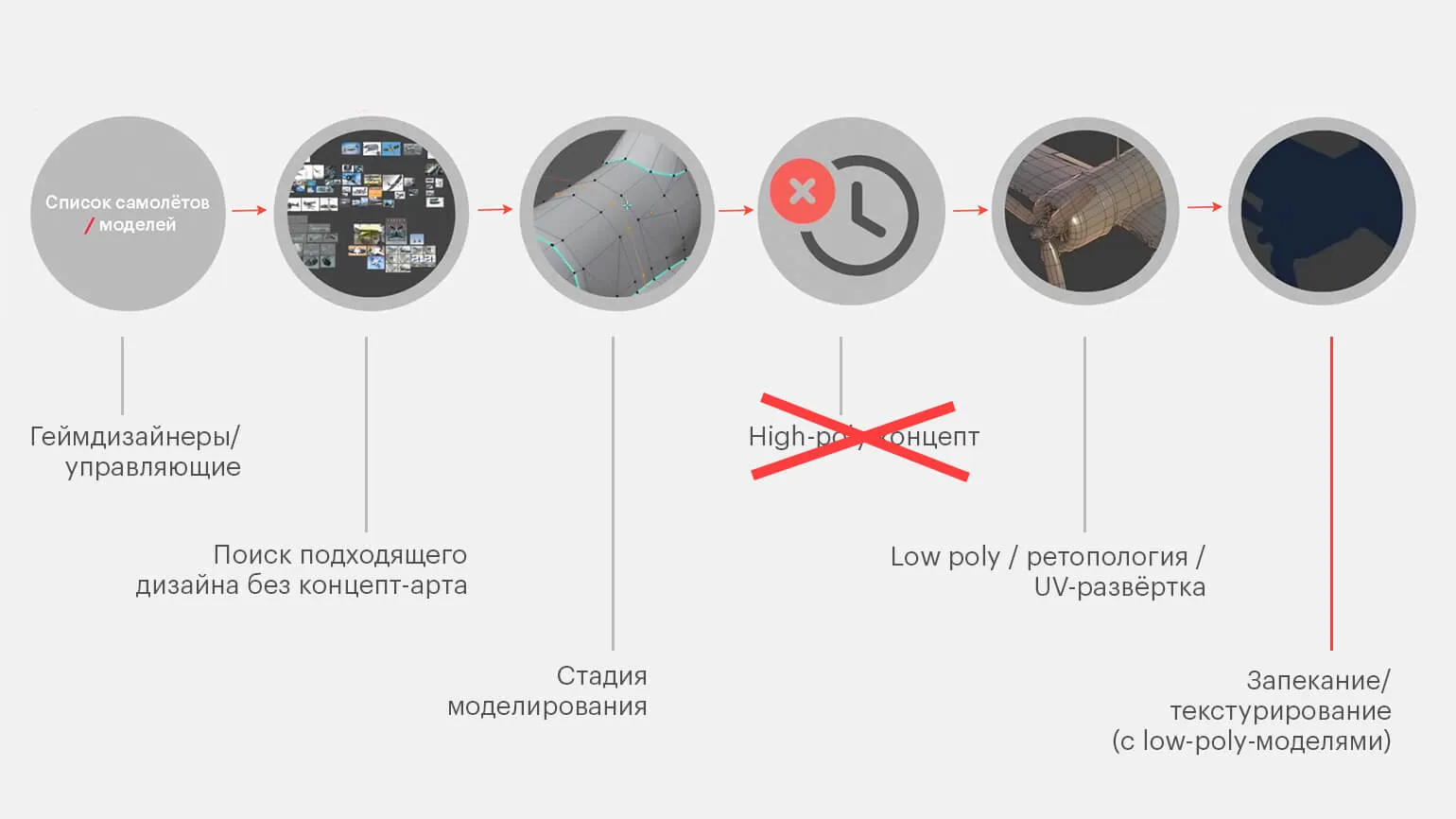 Обычно пайплайн 3D-художников реализован следующим образом: специалист получает концепт-арты и, ориентируясь на них, делает высокополигональную модель с большим количеством деталей, затем на её основе он создаёт низкополигональную модель, строит топологию и UV-развёртку, а после — запекает нормали с высокополигональной модели и дорабатывает остальные текстурные карты.