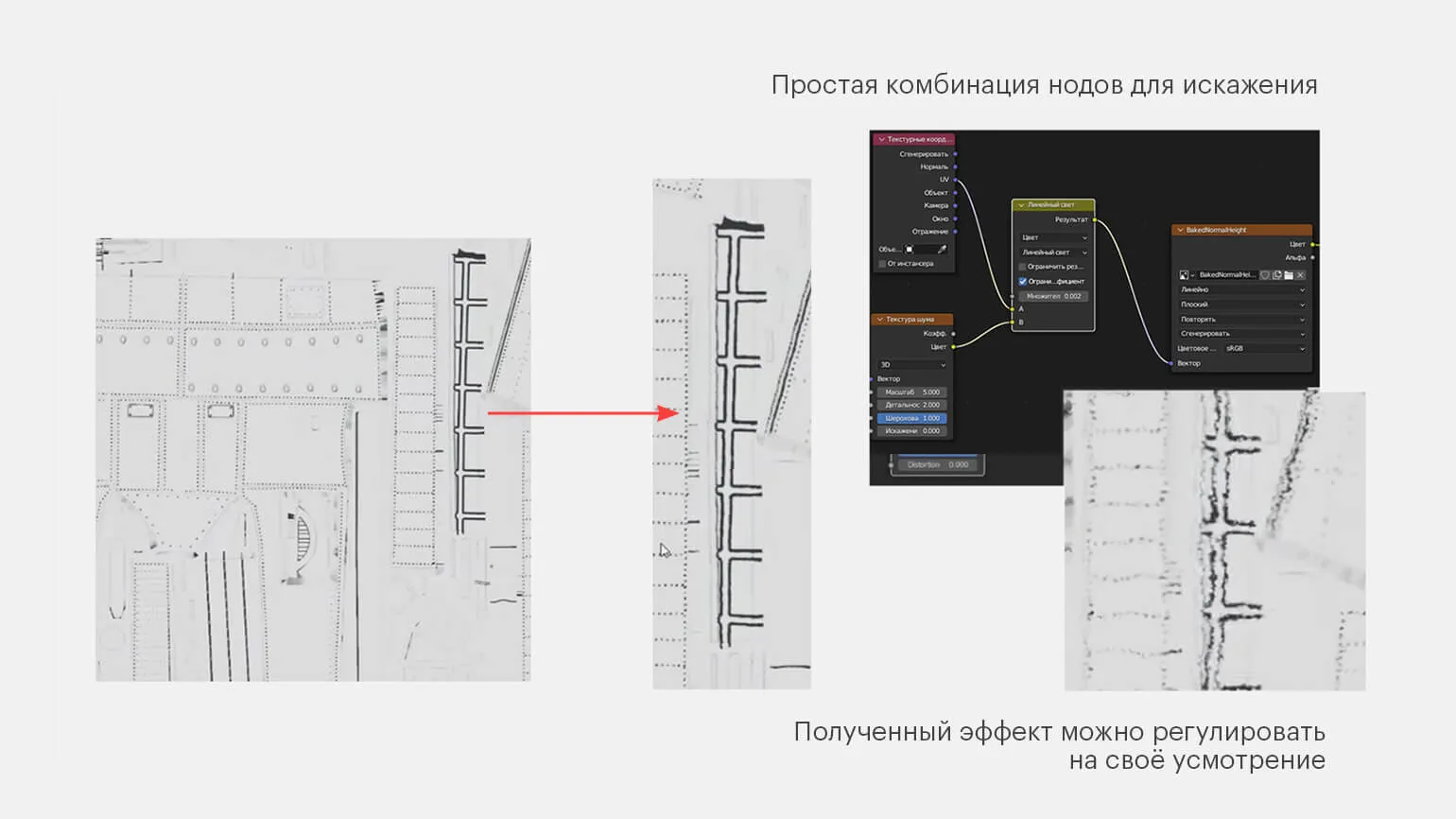 И в итоге получилась новая карта нормалей, сочетающая в себе основные линии форм и карту высот поверхности. Но проблема в том, что полученный рельеф от линий на модели выглядит слишком идеально. Поэтому в карту можно добавить искажения, используя связку нескольких нодов.