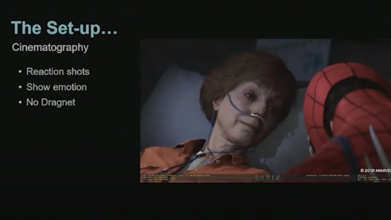 Разговор Питера Паркера с раненой Мэй проиллюстрирует чёткость трансляции эмоций. Когда Питер начинает разговор, камера показывает лицо Мэй, а когда начинает говорить она — геймер видит уже мимику Паркера, передающую его внутреннее состояние. Во время редактирования абсолютно всех сцен авторы думали, как сделать их ещё более вовлекающими в повествование с помощью эмоций.
