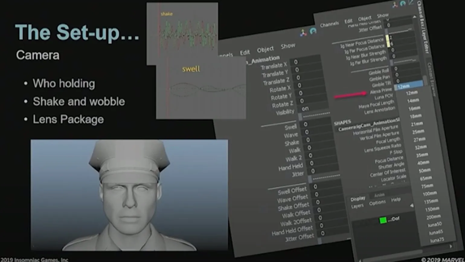 В авторской камере Insomniac Games есть несколько полезных ползунков, которые позволяют настроить и уровень дрожания камеры, и чёткость кадра, и резкость при переходах от момента к моменту. Также в камере есть уникальный пак виртуальных объективов Alexa Prime, воспроизводящий крайне реалистичную картинку, который тоже сильно упростил работу команды авторов. Этот виртуальный пак предложил использовать для разработки Marvel’s Spider-Man опытный аниматор Джош Гридли, работавший над многими известными фильмами — такими как «Мстители» и «Варкрафт».