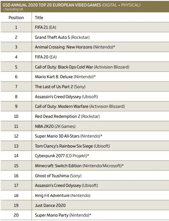 В странах Европы было продано 123,7 млн копий игр, что на 19% превышает показатели 2019 года. 58,7 млн были приобретены в «цифре», и это на 47% больше, чем годом ранее. Несмотря на ограничения, вызванные пандемией COVID-19, и закрытие розничных магазинов, на рынках континентальной Европы было продано 65 млн копий игр на физических носителях. Это превосходит результат 2019 года на 0,8%.