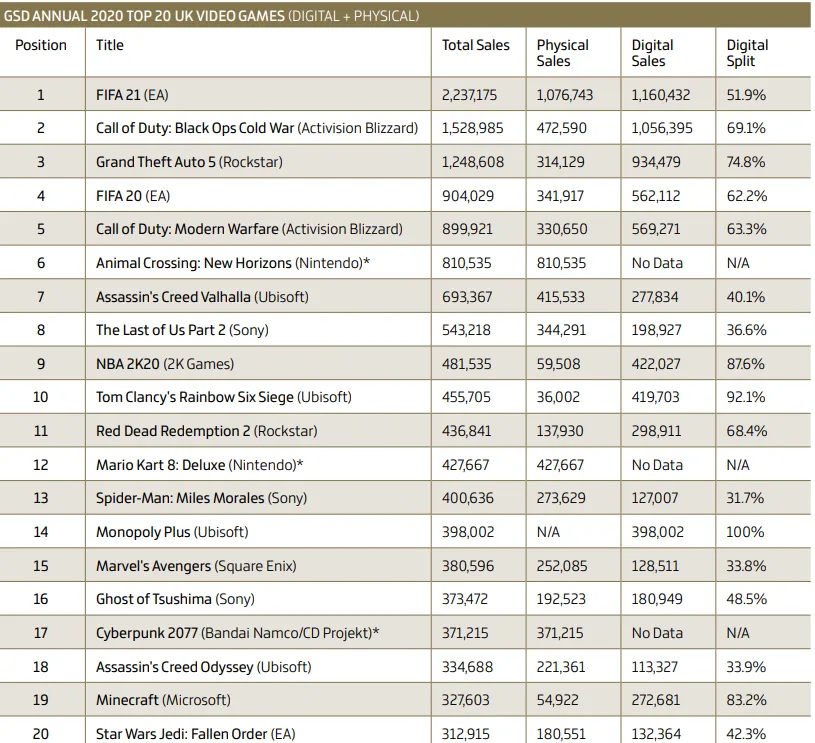Самым успешным издателем физических экземпляров игр стала Nintendo. За 2020 год она продала 20,5% от общего объёма, на втором месте расположилась EA c 12,4%. Самый крупный издатель в «цифре» — Ubisoft, её доля продаж на рынке в 2020 году составила 18%. На втором месте — снова EA c 15% рынка.