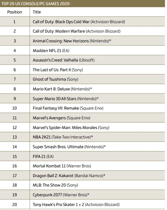 Следующей в списке новинкой после FIFA 21 стала Animal Crossing: New Horizons, занявшая третье место. Компания Nintendo не предоставляет данные о продажах цифровых версий своих игр, поэтому вполне возможно, что она могла бы занять более высокую позицию в списке.