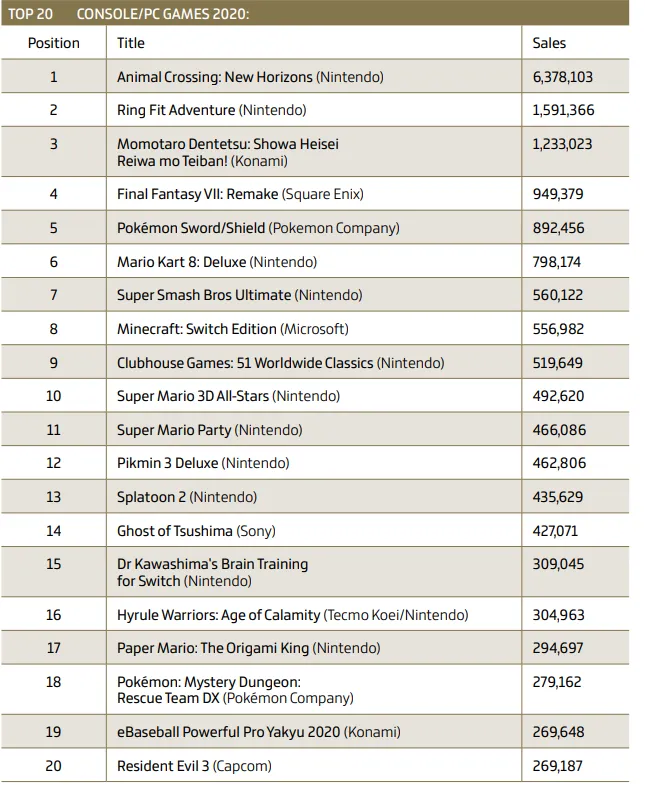 Топ-20 консольных/PC-игр 2020 года в Японии: