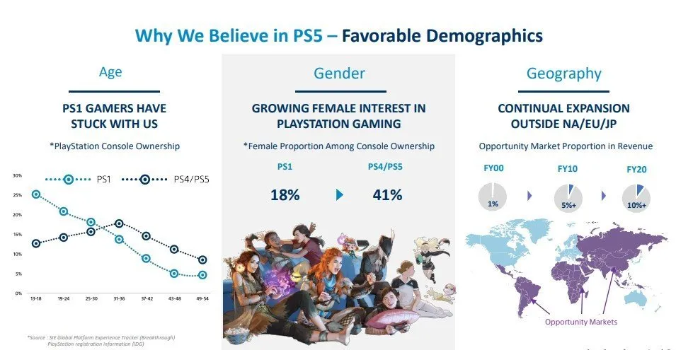 Бренд отметил, что владельцы PS4 и PS5, старше, чем те, кто играет на оригинальной PS1. Это, по мнению компании, доказывает, что её аудитория продолжает пользоваться консолью на протяжении многих поколений.