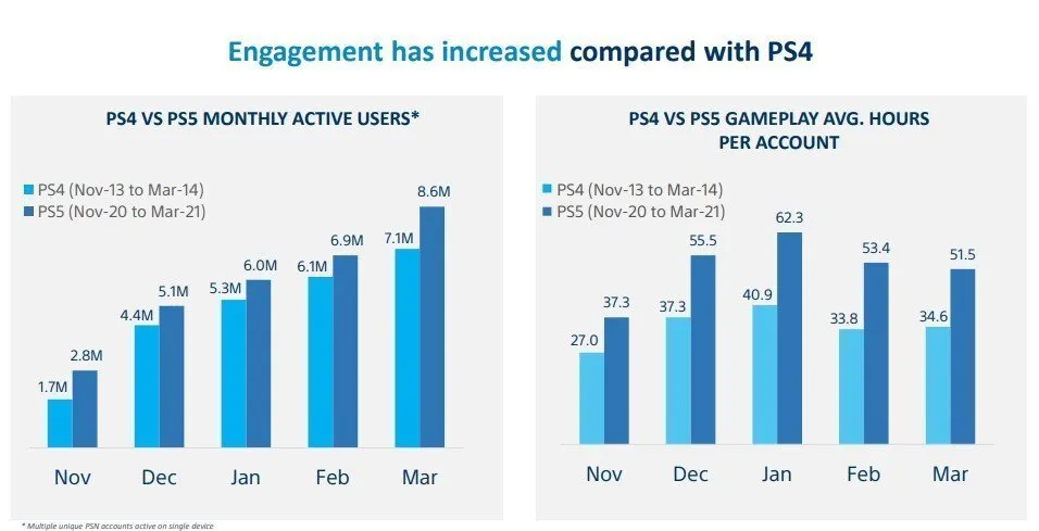 С точки зрения вовлечённости, которая становится все более важным показателем для производителей консолей, PS5 успешно стартовала на рынке. Sony сообщает, что число активных пользователей PS5 в марте 2021 года равнялось 8,6 млн против 7,1 млн у PS4 за аналогичный период времени. Причина, по которой количество активных пользователей PS5 выше продаж консоли, заключается в возможности использования нескольких уникальных учётных записей на одном устройстве.