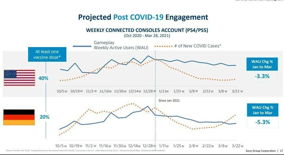 Sony продемонстрировала слайд, на котором можно увидеть снизившийся показатель количества еженедельных активных пользователей после выпуска вакцины от COVID-19: он упал на 3,3% в Северной Америке и на 5,3% в Германии.