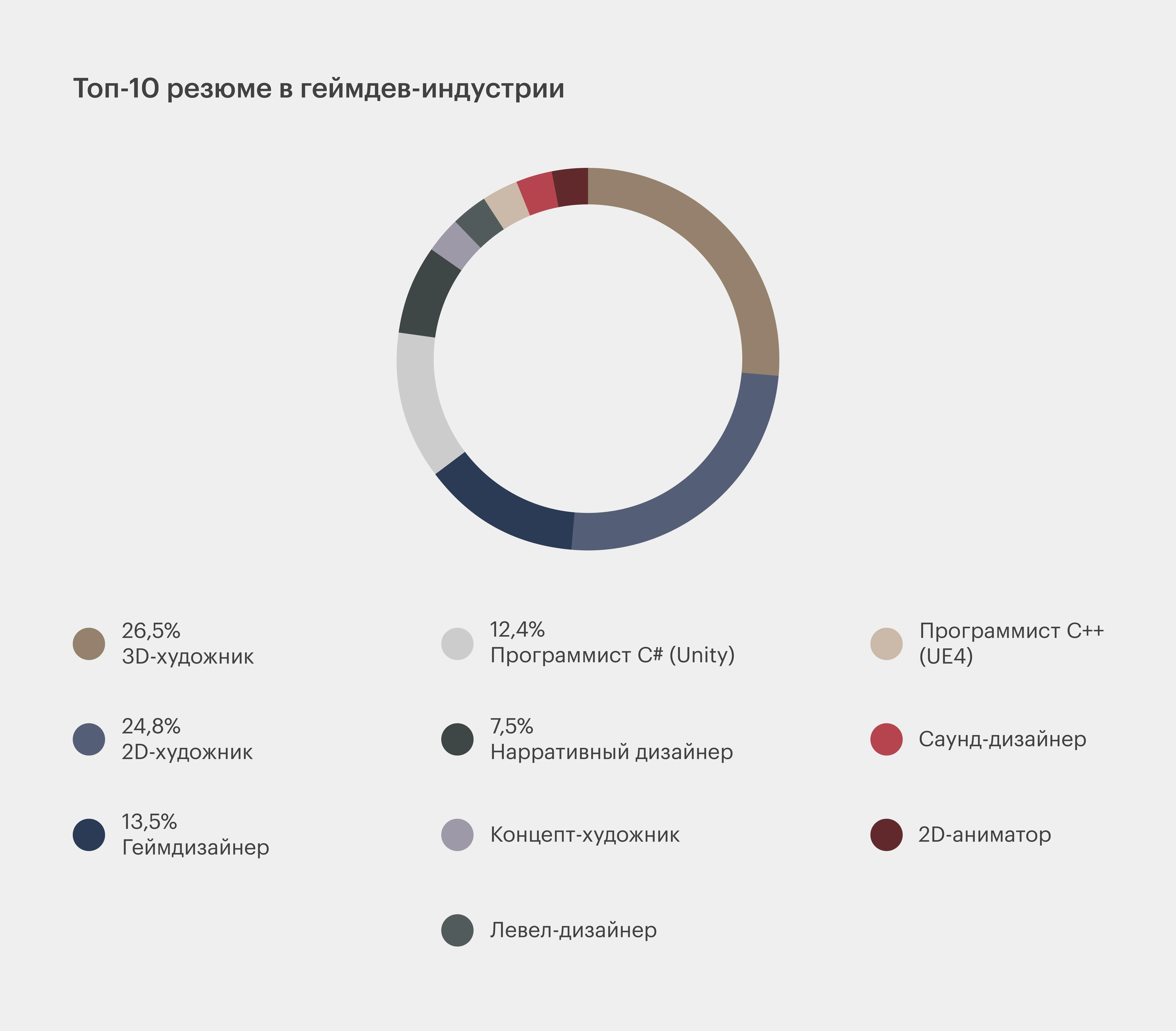 Спрос практически совпадает с предложением. На втором и третьем месте по количеству резюме в геймдеве, согласно статистике GDJob.pro, как раз расположились 2D-художники — 24,8% и геймдизайнеры — 13,5%. Однако больше всего на рынке 3D-художников — 26,5% резюме принадлежит именно им.