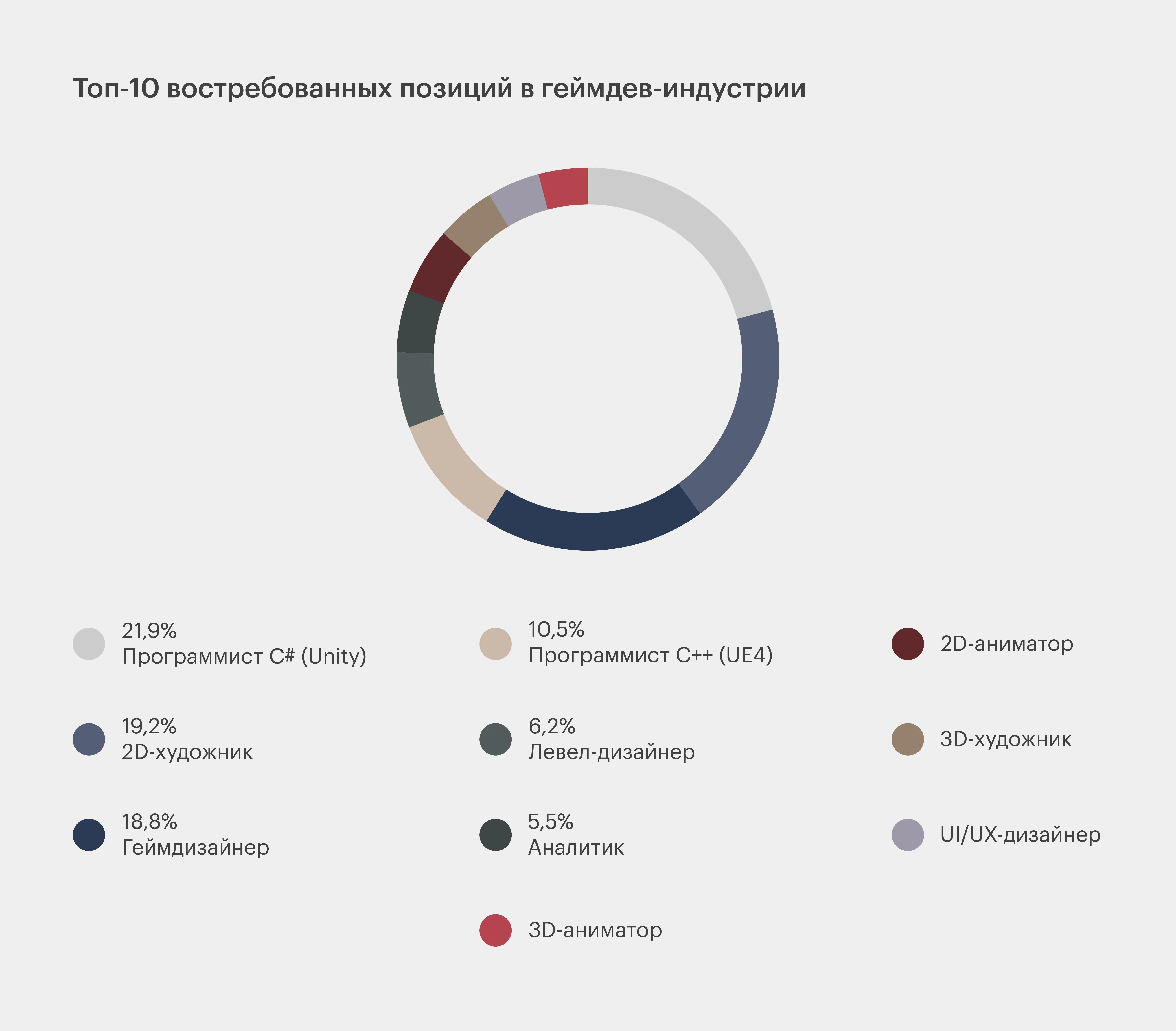 Согласно внутренней статистике GDJob.pro, в геймдев-индустрии чаще всего ищут специалистов на должность программиста C# (Unity 3D) — 32,1%, 2D-художника — 19,2% и геймдизайнера — 18,8%.