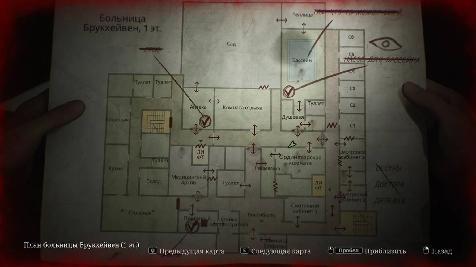 А вот в зданиях вроде лечебницы Брукхейвен или апартаментов «Вудсайд» начинается замес. Как правило, сразу после того, как Джеймс попадает на локацию, он находит подробную карту помещения — и дорисовывает её в ходе решения квестов. И каждое такое здание — это огромная сложносочинённая головоломка с пазлами поменьше внутри.