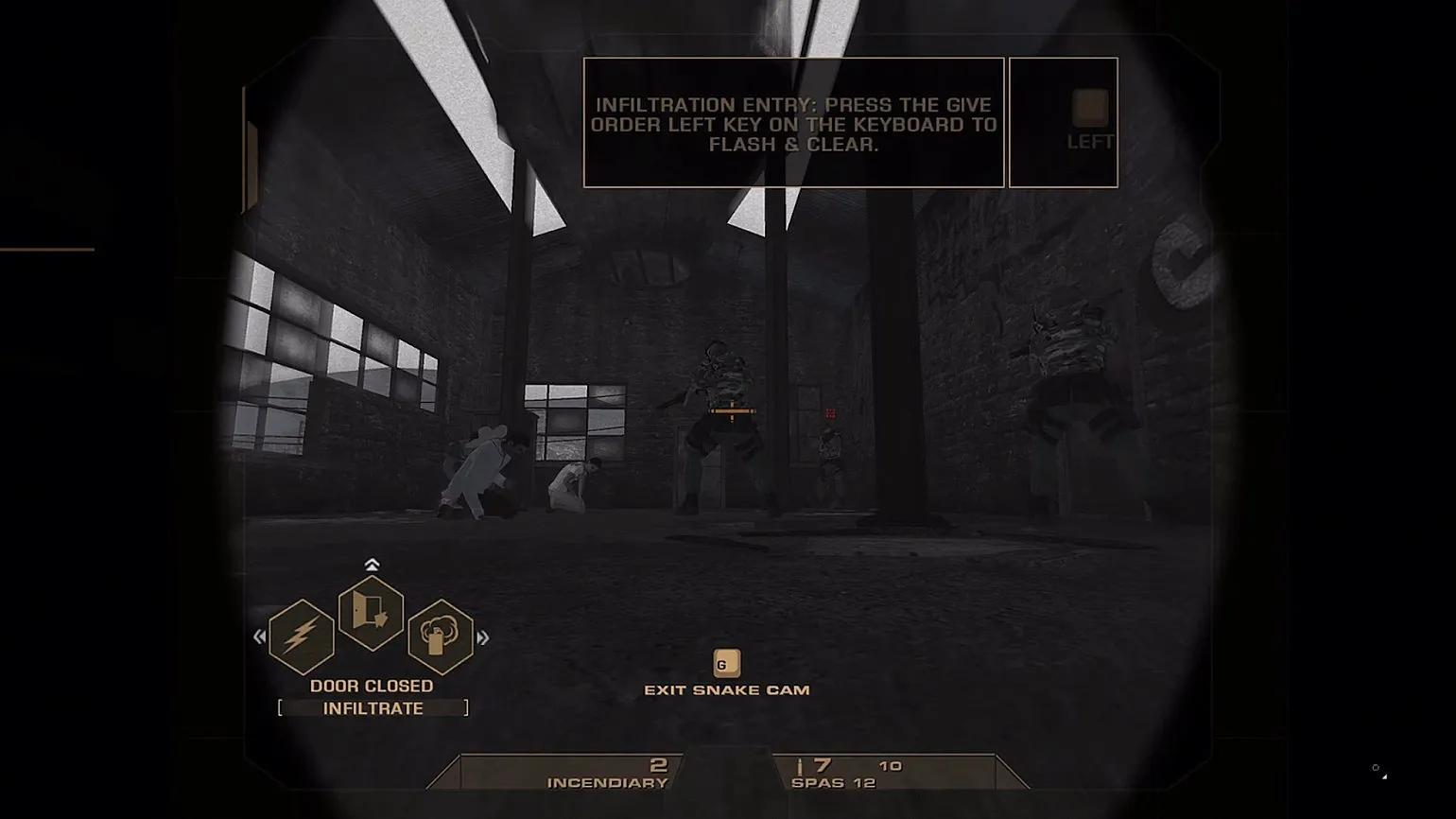 В описанной ситуации вы можете воспользоваться щупом с камерой и расставить приоритеты для нейтрализации, затем закинуть светошумовую гранату в комнату и использовать доли секунды для зачистки. Либо подождать, пока противник отвернётся, и незаметно прокрасться мимо него — или же «снять» его с пистолета с глушителем.