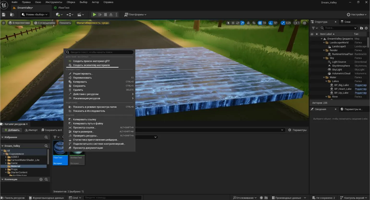 В Каталоге ресурсов (Content Browser) находим последний материал, над которым мы работали. Вызываем всплывающее меню нажатием ПКМ по значку ассета и выбираем самый верхний пункт — Создать экземпляр материала (Create Material Instance).