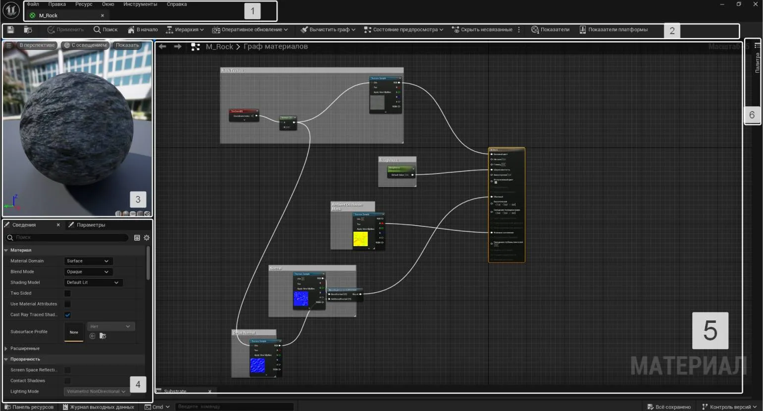 Большинство операций в редакторе материалов происходит в окне Графа материалов (Material Graph) — №5. Это пространство для сборки нодов-компонентов. По умолчанию в графе есть только один главный нод с большим количеством слотов-свойств, к которым пользователь «подключает» дополнительные ноды и таким образом формирует поверхность материала.
