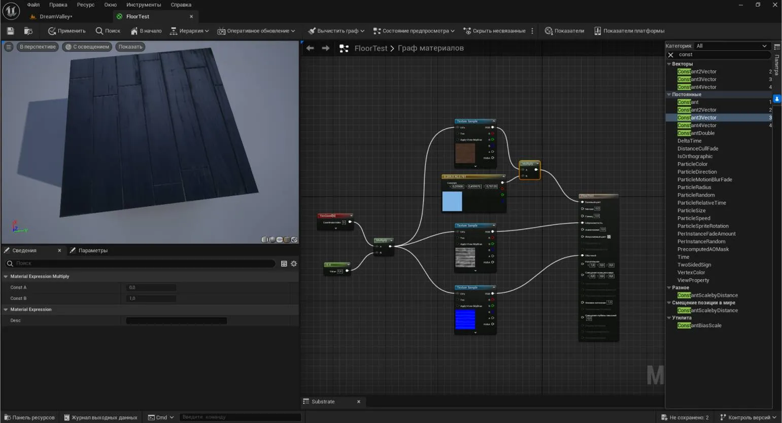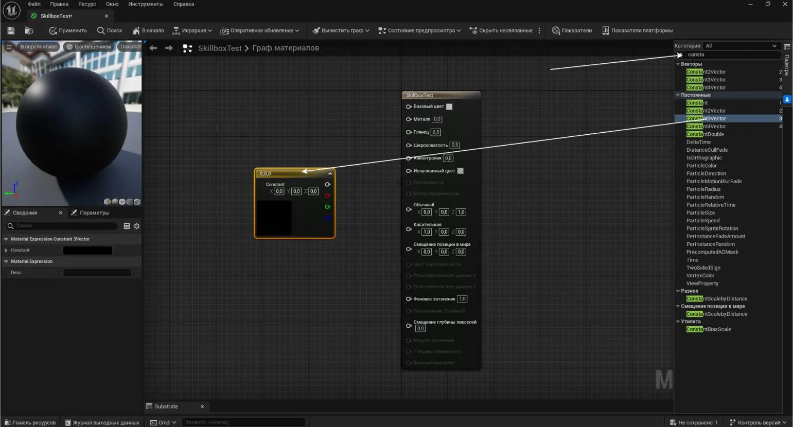 Двойной клик ЛКМ по ассету откроет редактор материалов. Для начала попробуем создать цветной материал. В Unreal Engine за цвет отвечает узел Constant3Vector. Находим его в Палитре (Pallete) и переносим в область графа.