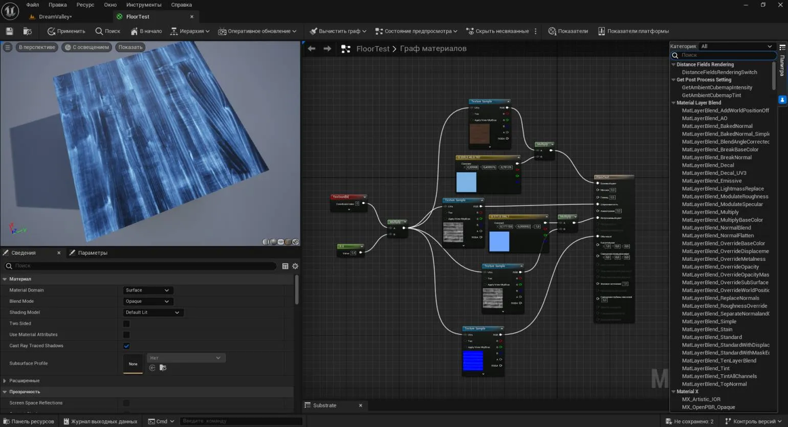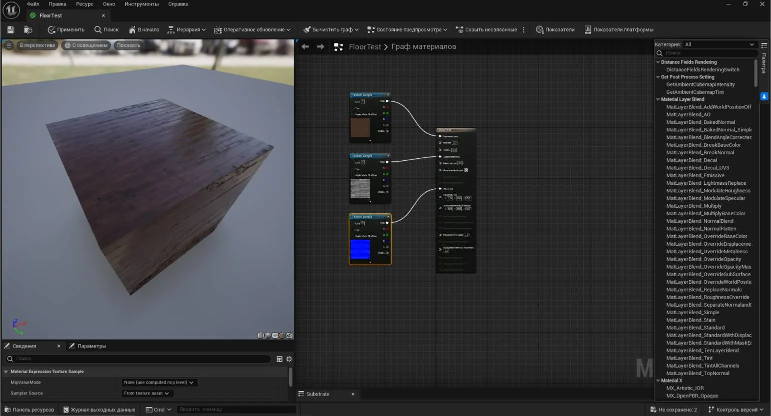 На скриншоте выше ноды связаны по самой простой схеме. Скомпилируем материал и перенесём его на объект в сцене (в нашем случае — на условный пол сцены).