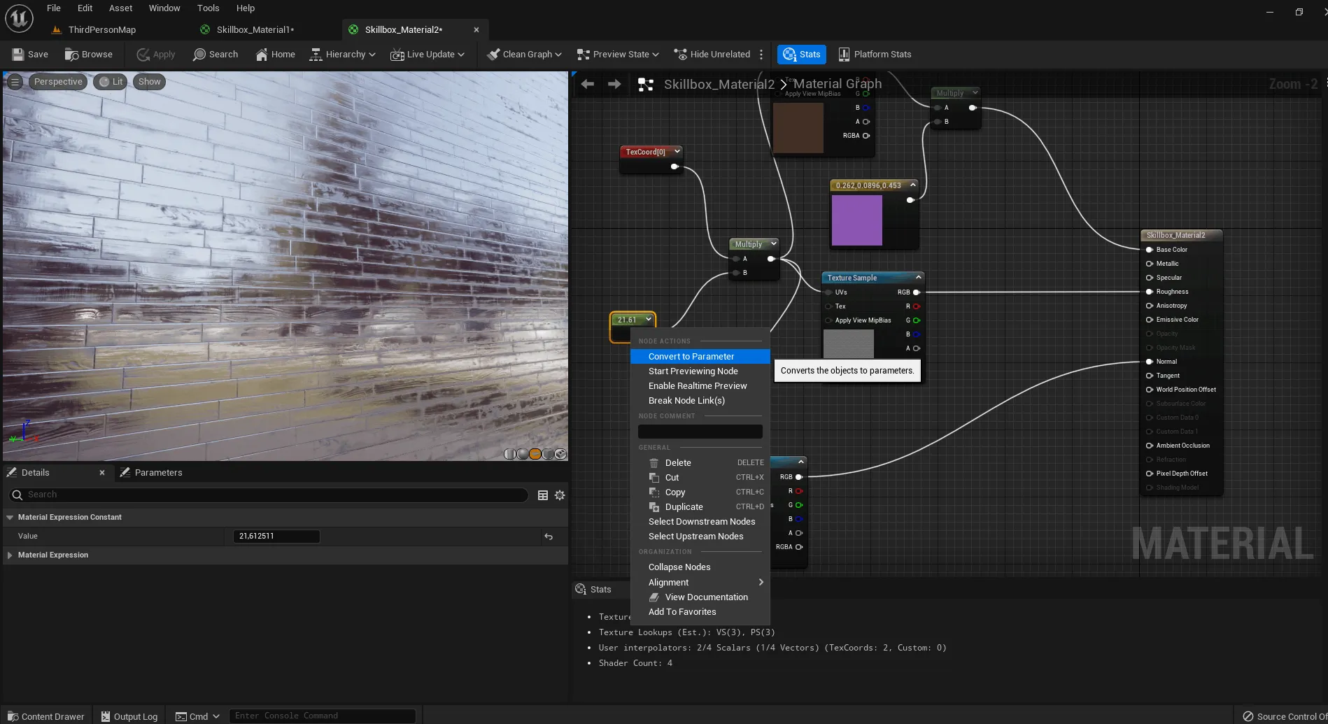 В папке появится копия ассета с припиской _Inst. Если мы применим его на любой меш сейчас, он будет выглядеть как и оригинальный материал, так как он обладает теми же характеристиками. Попробуем задать параметр, который позволит регулировать масштаб текстуры в реальном времени. Возвращаемся в граф оригинального материала, находим нод Constant, связанный с размером текстур, кликаем по нему ПКМ и выбираем Преобразовать в параметр (Convert to Parameter).