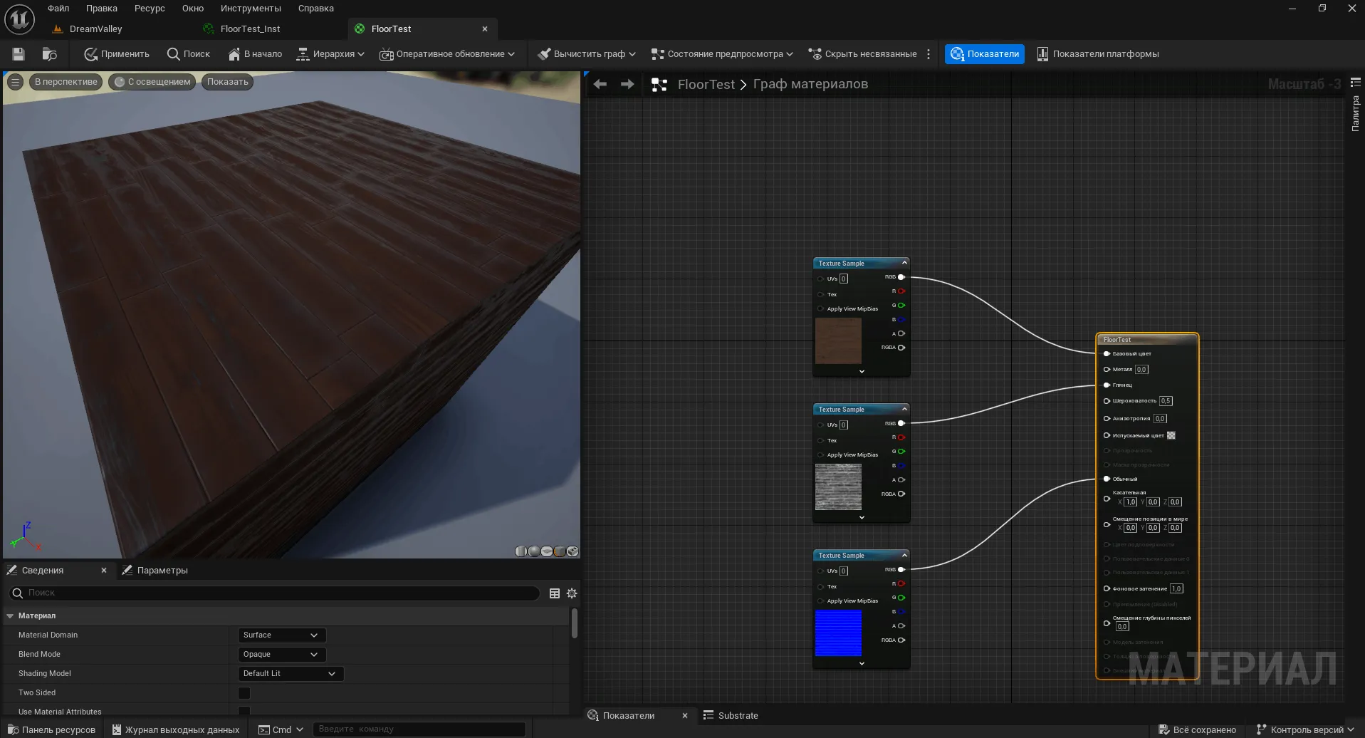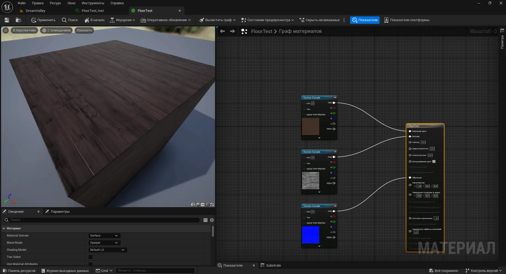 Перетаскиваем все три текстуры в редактор материалов и соединяем. С сочетаниями текстур и слотов можно экспериментировать, тогда получатся различные эффекты.
