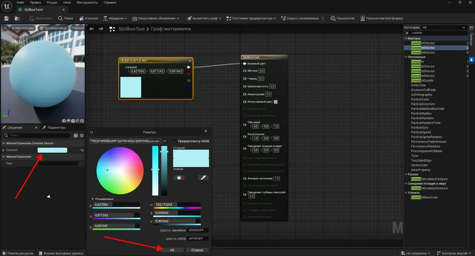 Двойной клик по созданному ноду открывает окно с выбором цвета. В более ранних версиях движка Значение (Value) — второй столбец справа от цветового круга — по умолчанию было нулевым, поэтому превью нода оставалось чёрным даже при выборе цвета, и его приходилось регулировать вручную. В 5.4 значение автоматически стоит на максимуме, и его регулируют, если нужно изменить насыщенность цвета.