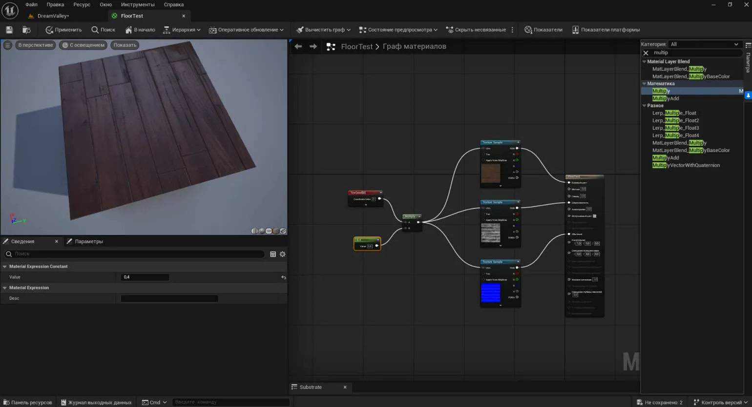 Теперь попробуем придать паркету другой оттенок с помощью уже знакомого нам нода Constant3Vector. Процесс настройки аналогичен тому, что был описан ранее для первого материала: с помощью узла Multiply связываем обычную текстуру и новый нод Constant3Vector. Компилируем и смотрим результат в сцене.