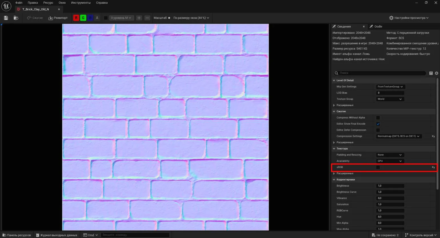 В качестве примера вновь воспользуемся контентом из Starter Content. Мы выбрали три текстуры T_Wood_Floor_Walnut. Если хотите подгрузить свои — их можно поместить в новую папку или перенести в уже существующую методом перетаскивания из проводника. Перед работой также убедитесь, что в текстуре для нормали не стоит галочка напротив параметра sRGB: движок должен распознать текстуру как дополнительную маску, а не как цветное изображение.