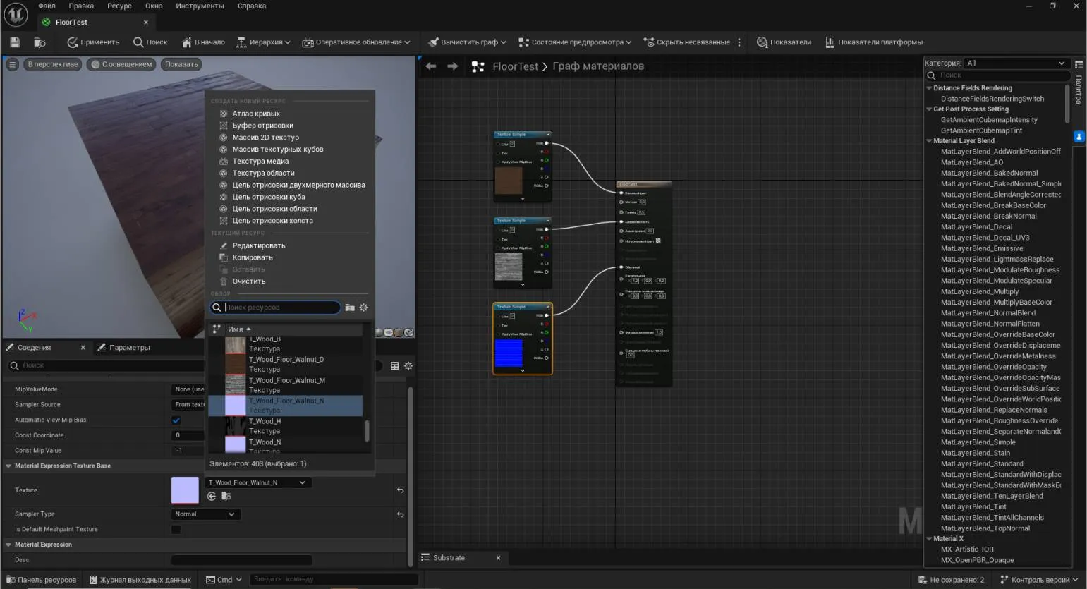 Если текстуру материала нужно заменить, достаточно нажать на вкладку напротив превью изображения в панели Сведения (Details). После этого откроется список со всеми текстурами проекта.