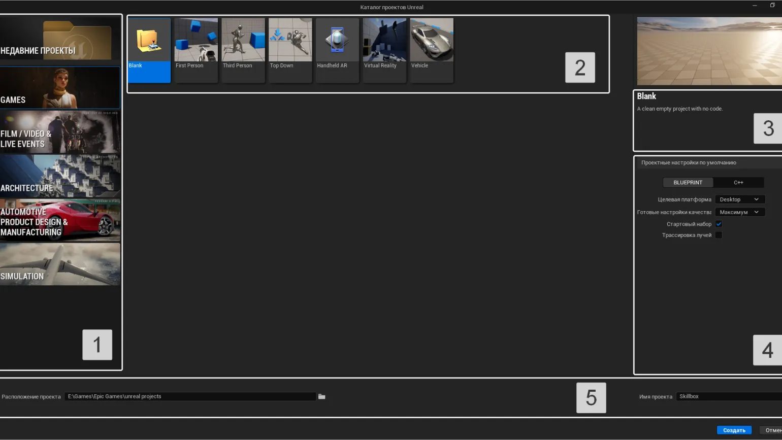 В области №1 расположены пять категорий шаблонов и «Недавние проекты» (Recent Projects) — секция, где можно посмотреть уже созданные вами проекты, в частности созданные на Unreal Engine 4 (они же отображаются и в «Библиотеке» лаунчера Epic Games). Если открыть эту вкладку, то в самом низу слева будет пункт «Всегда загружать последний проект при запуске» (Always load last project on startup). Отметьте его, и при запуске редактора всегда станет загружаться последний проект, над которым вы работали.