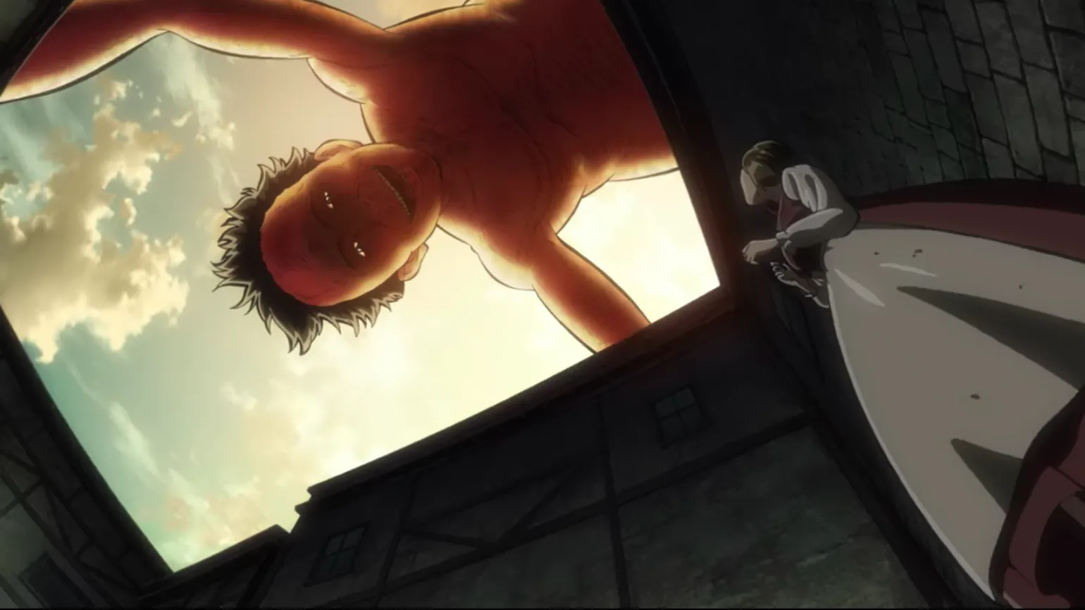 Однако кошмар однажды случается: стену ломает гигант и через дыру в город устремляются чудовища. Они выглядят как голые люди с искажёнными то ли радостью, то ли болью лицами. Двигаются чудища как-то неестественно. Но главный ужас в том, что они здесь для того, чтобы убивать.