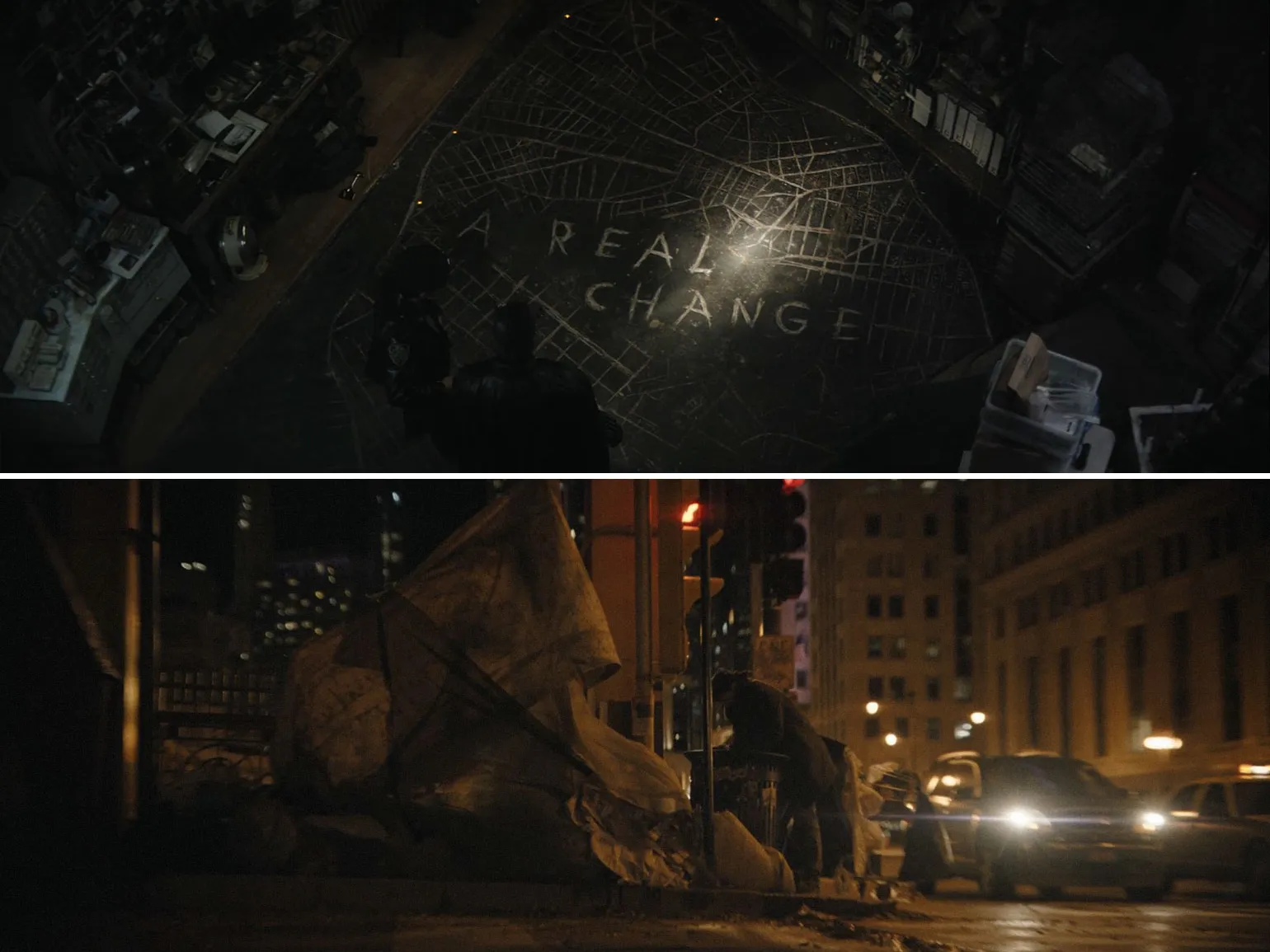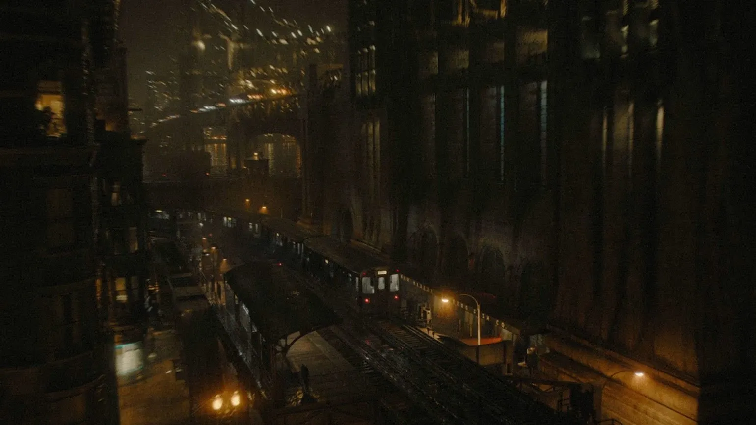 Режиссёр вместе с художником-постановщиком и здесь устраивают лабиринт. Город сконструирован так, чтобы избежать привязки к конкретной локации. Их Готэм — это не Нью-Йорк или Чикаго, а собирательное представление об американском мегаполисе, однажды захлебнувшемся собственным величием.