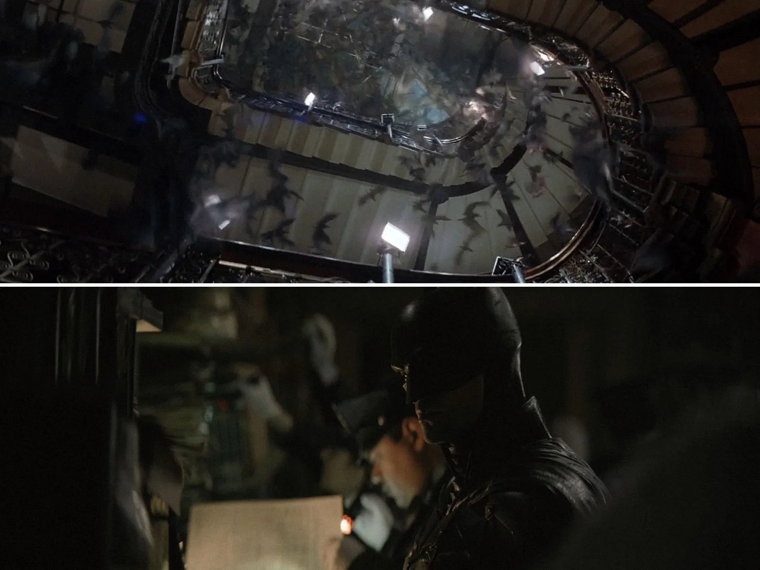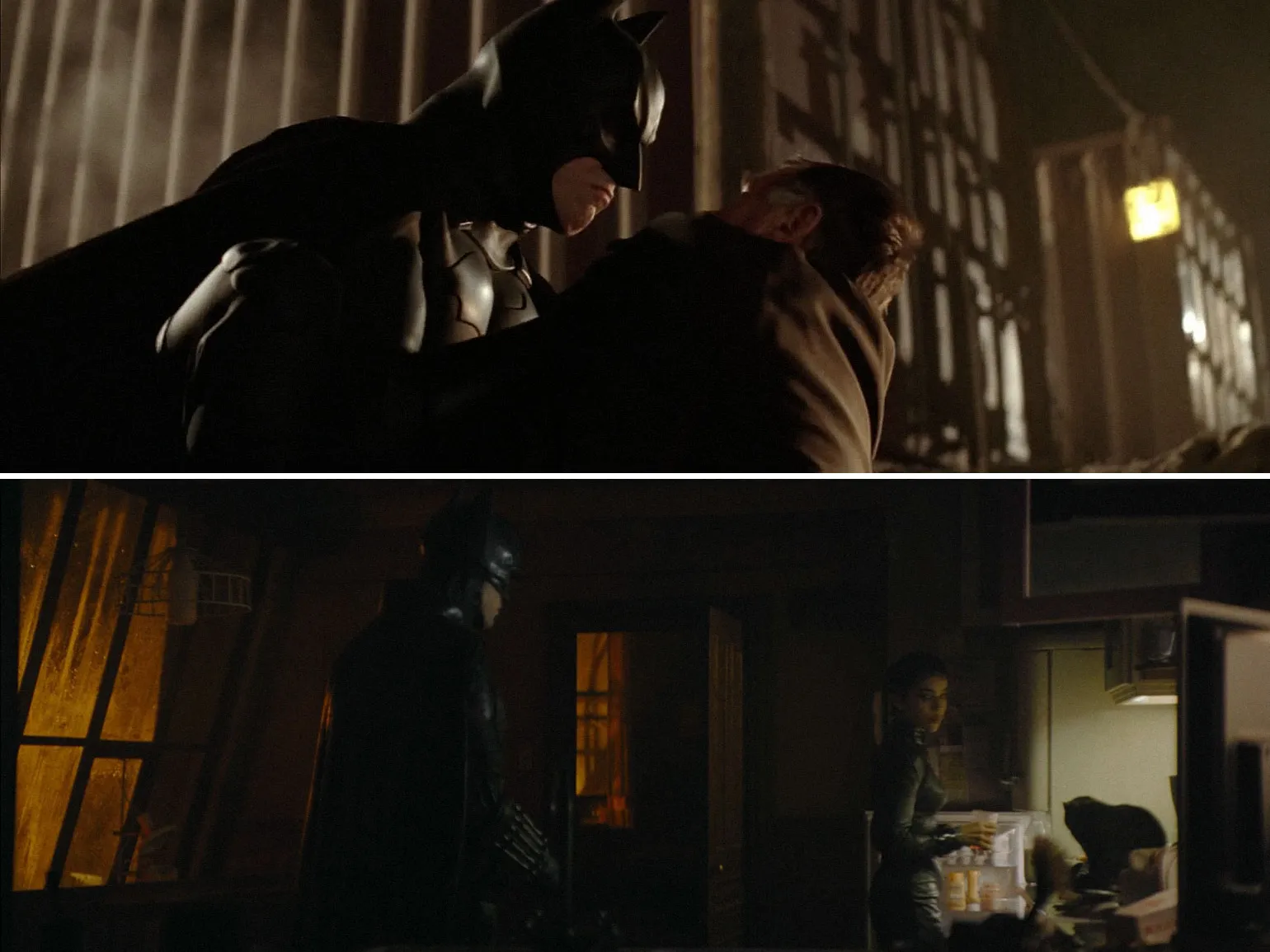 Для сравнения мы взяли первую часть эталонной трилогии Кристофера Нолана, где герой также начинал свой путь и решал проблему самоидентификации. При этом в фильме Нолана развитие героя происходит от одной экшен-сцены к другой, а в фильме Мэтта Ривза — с нагнетанием саспенса и неспешной детективной линией.