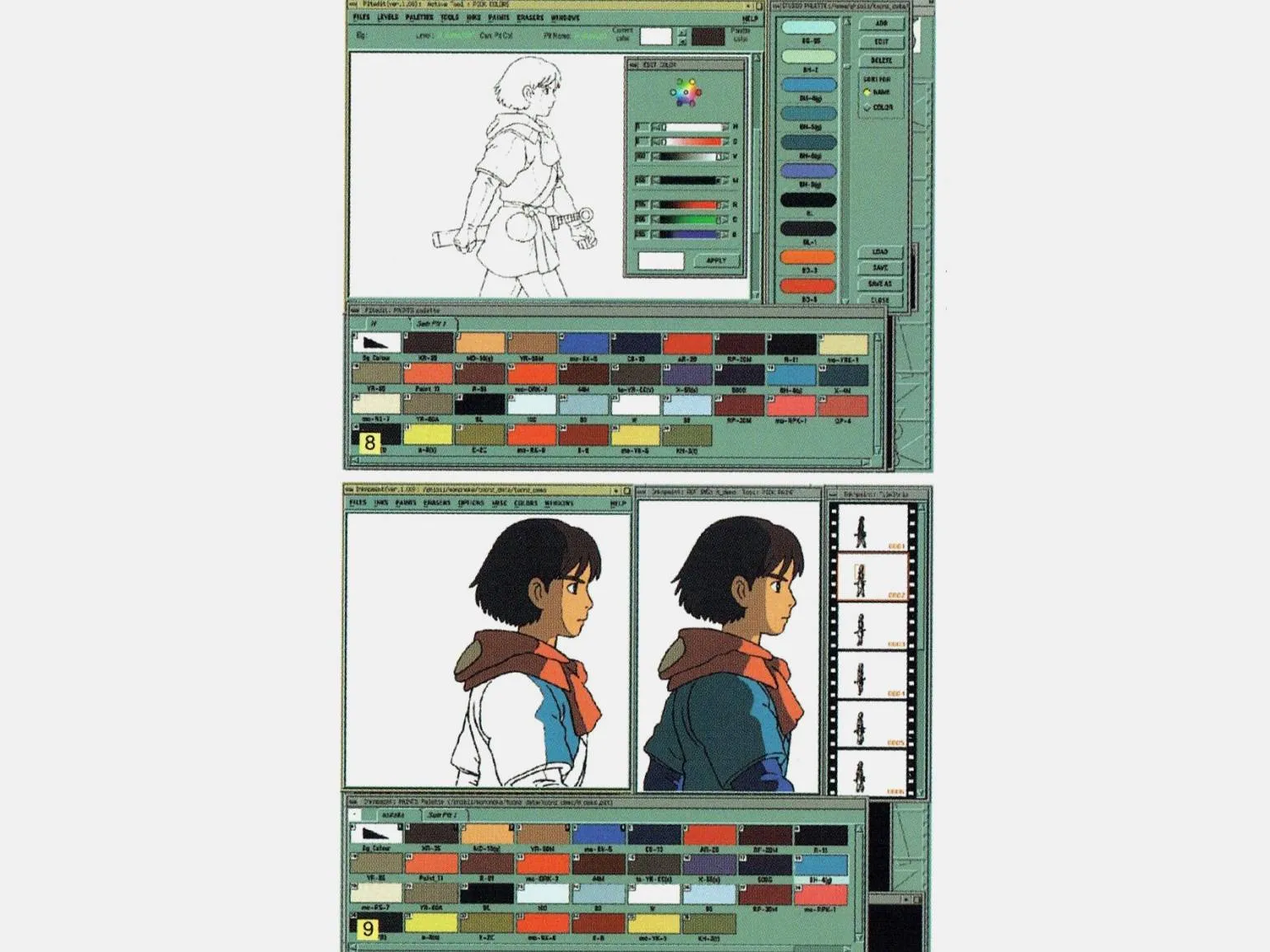 Несмотря на большие возможности цифровых редакторов, в студии подходили к ним осторожно и ставили ограничения. Например, цифра даёт художнику огромное количество цветов, свыше 16 тысяч на тот момент, — это намного больше, чем когда-либо смогут дать акриловые краски. Но столько художнику-аниматору не нужно: у каждого фильма студии есть установленная цветовая палитра, и у «Принцессы Мононоке» в том числе.
